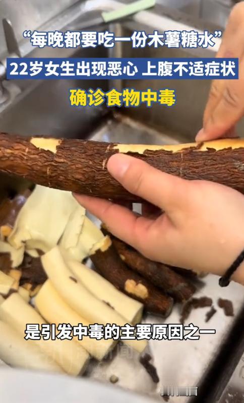 “悲剧还是发生了!”近日,浙江宁波,一女子快吃木薯甜品,每晚都要来上一份,这天深夜,她突然剧烈腹痛、恶心呕吐,吃过胃药后仍无法缓解,紧急送医后竟被确诊为急性肠胃炎合并食物中毒!网友:从小喝到大的糖水居然有毒! 木薯糖水是很多人喜欢的治愈甜品,粉糯的木薯裹着清甜的糖水,是很多人从小吃到大的味道,也几乎没人会把它和中毒联系到一起。 据媒体1月14日报道,22岁的吴女士是个不折不扣的甜品控,尤其偏爱木薯糖水——绵密粉糯的木薯裹着清甜的糖水,一碗下肚,连加班的疲惫都能消散大半。于是她几乎每天晚上都要来一碗。 起初,她只是偶尔觉得吃完糖水后肚子隐隐发沉,还以为是自己肠胃敏感,随便吃颗胃药就糊弄过去。直到一周后的深夜,她突然一阵感觉剧烈的恶心涌上喉咙,紧接着上腹部传来刀绞般的痛感,疼得她蜷缩在沙发上冷汗直流,连平日里管用的胃药都压不住这股钻心的难受。 随后她被紧急送往医院治疗,就医后吴女士被确诊为急性肠胃炎合并食物中毒,而罪魁祸首正是她每晚必点的木薯糖水。好在经过洗胃、补液等对症治疗,吴女士的症状终于得到缓解。 医生解释,生木薯中含有氰苷毒素,这种毒素无色无味,若处理不当,毒素无法完全分解,食用后就会引发中毒。 信息来源:《“每晚都要吃一份木薯糖水”,浙江22岁女子确诊食物中毒》潮新闻