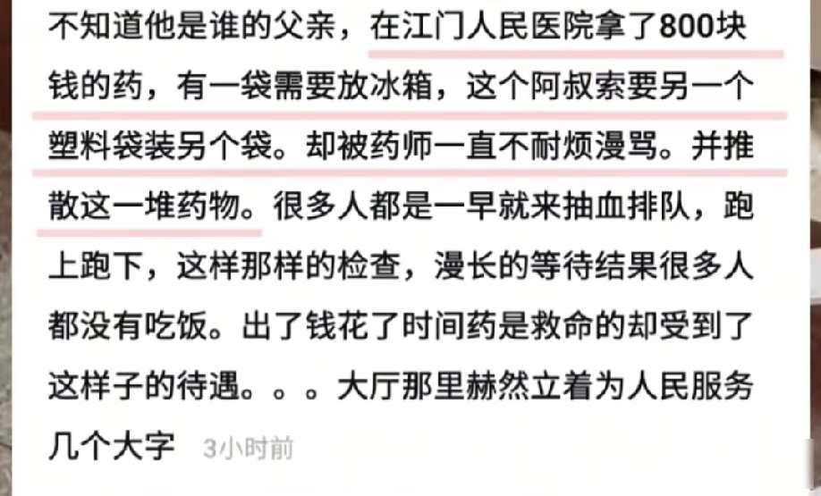 广东江门,网友发视频称:江门人民医院,一个老人家拿了800块的药,一袋需放冰箱,所以不能混在一起装。索要个塑料袋另装受到年轻药师漫骂,并扔掉所有药。当时阿叔身子颤颤巍巍激动无比,忍无可忍…… 前几天广东江门的事闹得挺大,一位阿叔去医院拿药,八百多块的药,说要分两袋装,一袋得放冰箱,另一袋不能冻,药店的小姑娘却说只能给一个免费袋子,阿叔想多要一个袋子,对方立马急了,指着人骂,转身把药全摔地上,阿叔手抖得厉害,脸都白了,旁边好几个人看着,谁都没说话。 医院后来出来说制度确实只给一个袋子,可年轻员工态度不好,这话一出,大伙更气了,现在哪家医院不是天天进账,买菜买肉多拿个袋子老板都乐意,八百块的药连个塑料袋都不肯给,昨天我去菜场买鱼,老板还主动拿干布包好,这医院抠抠搜搜的样子,跟街边小贩一比,差远了。 网上越吵越凶,有人讲医院该改改规矩,也有人怪老人自己早该说清楚,可谁家老人看病不是图个省心,年轻员工脾气这么大,到底是为省几毛钱的袋子,还是真觉得老人不懂事,这事吧,说大不大,说小不小,可看在眼里,心里就是不舒服。