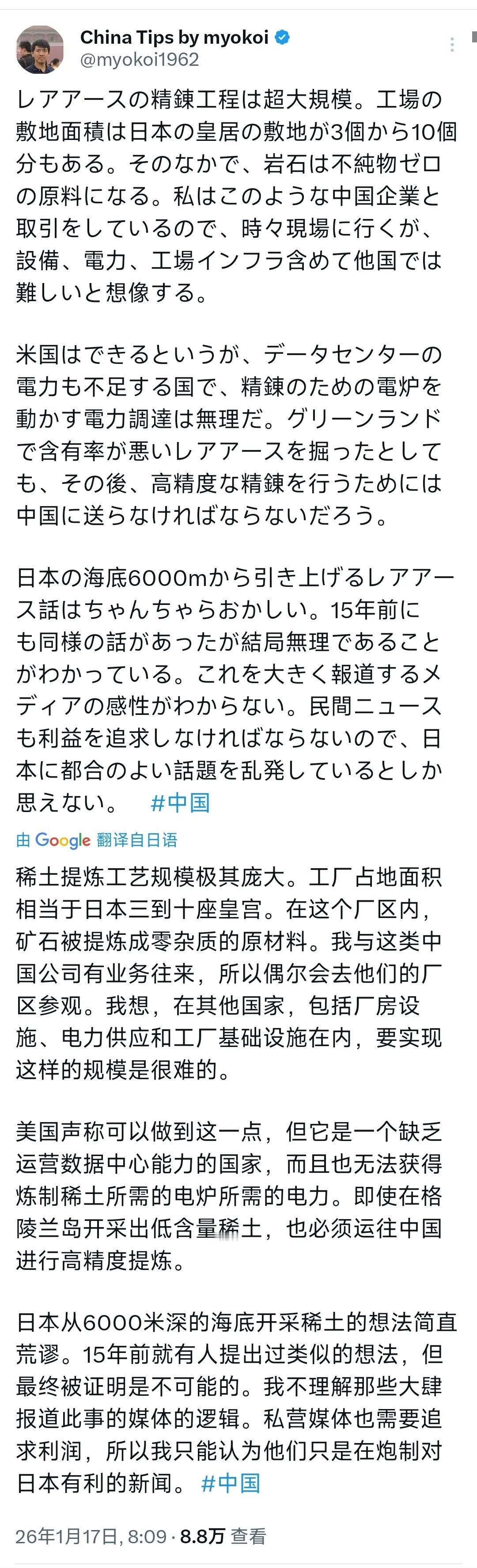 1月17日,一个亲自参观过我国稀土提炼工厂的日本人在社交平台发文,竟然毫不客气地