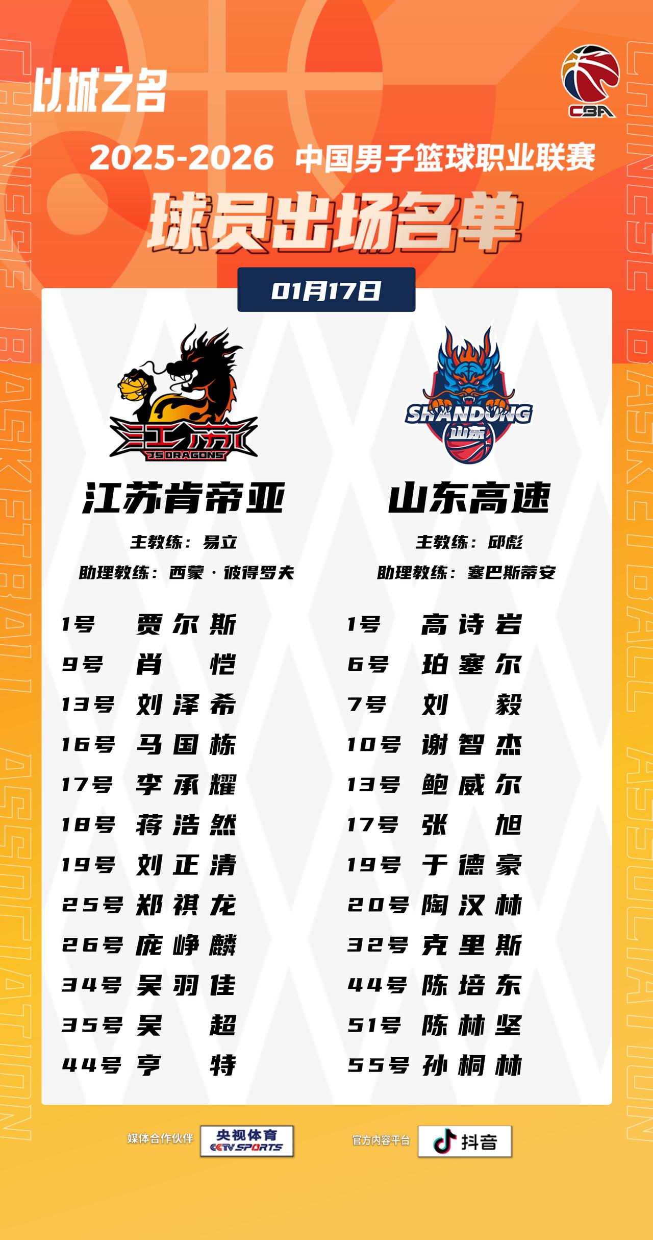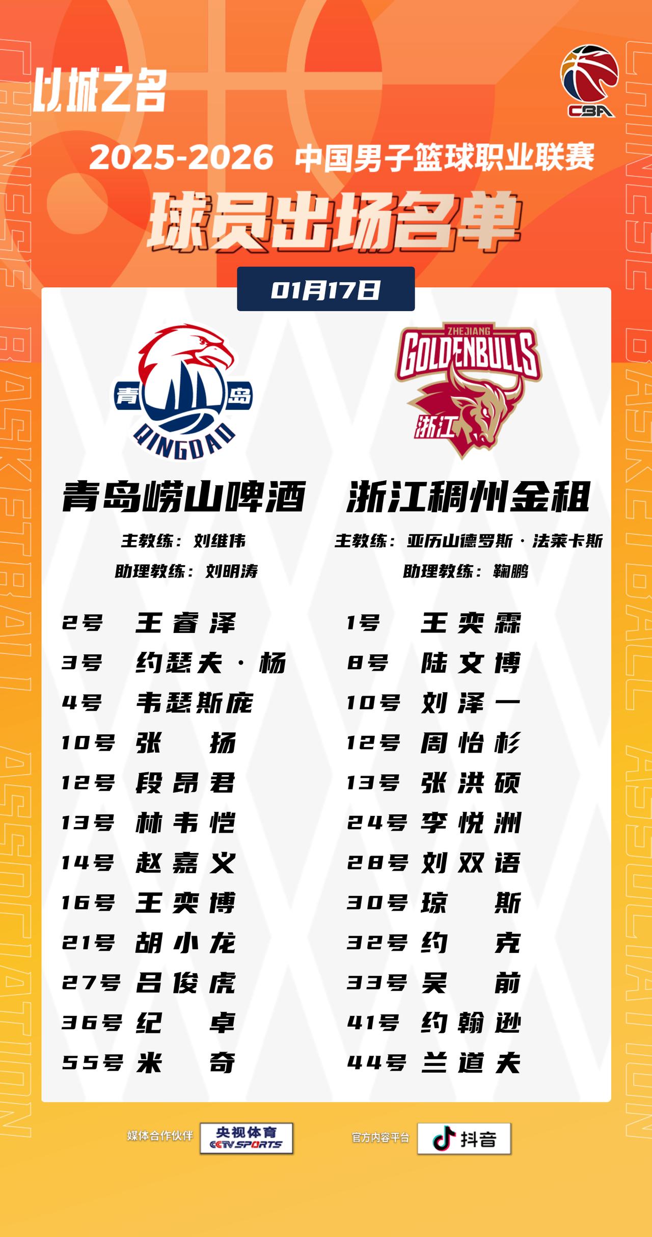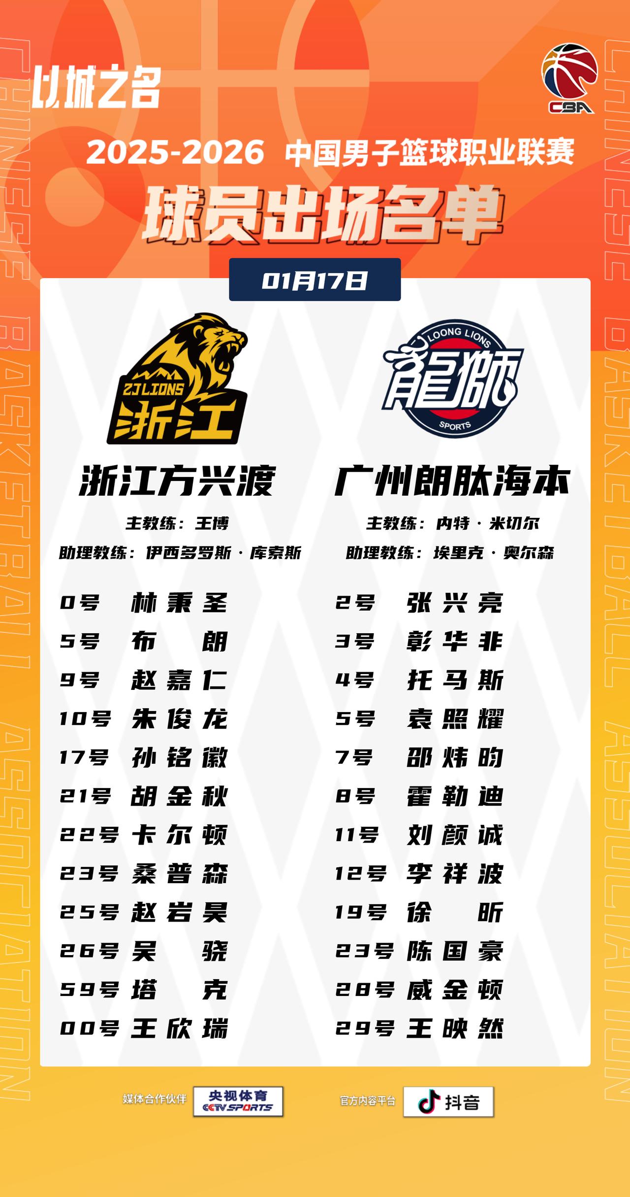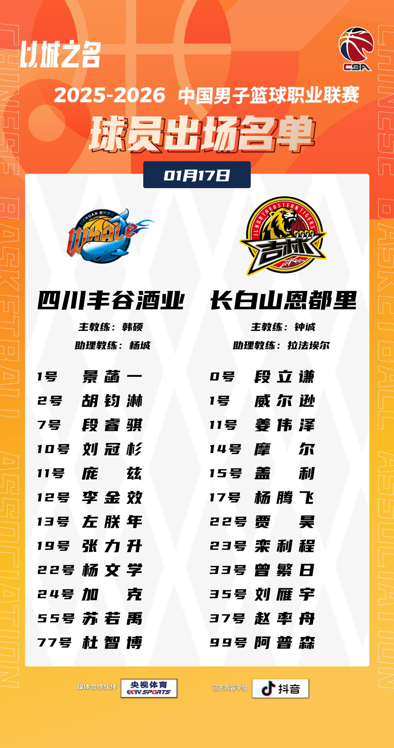 【大名单出炉】2025-2026赛季CBA联赛常规赛第十六轮今晚开打,5场比赛将在19:35同时跳球,敬请期待!