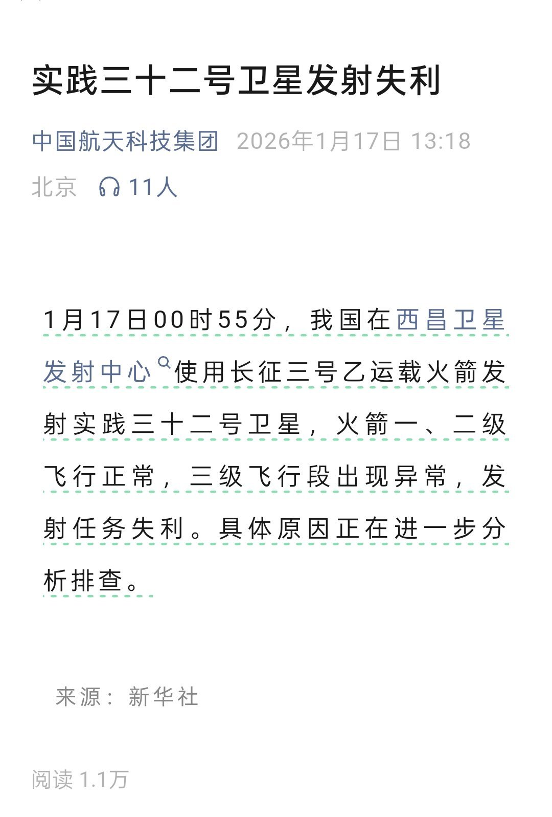 实践三十二号卫星发射失利此次原因是长征乙三级飞行段出现异常