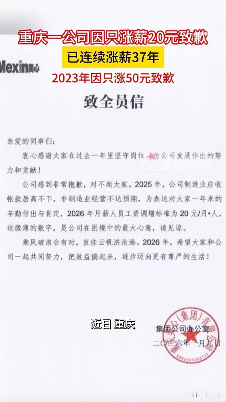 又是一家良心企业,公开向职工道歉🙇涨薪20元。 重庆美心集团因26年仅上调员工月薪20元而发布致歉信,公司在道歉函中说明了,因25年制造业应收账款居高不下、并非是非新生产造业经营未达预期,公司仅能为月薪员工每人上调工资20元/月。信中称这是“困境中的最大心意”,并对员工表达歉意。 这封道歉函用书面形式说明了在生产量充足的情况下为何只给职工涨薪20元的原因,并非是管理层吃的太肥了而是由于应收账款的问题。这家公司在25年企业在财务困难的环境下,公司未裁员降薪反而坚持涨薪,让员工感到安心、感激且充满职业安全感。此举传递出企业与员工共渡难关的决心,多数职工表示理解公司困境。 还有一个背景就是该企业此次调薪是自1989年公司成立以来连续第37年为员工涨薪,此次涉及6000余名员工,20元虽少,但37年雷打不动的传统远超金额本身的价值。对比部分企业欠薪、裁员等行为,美心主动致歉的举措真的是良心企业典范。相比起一分不涨还降薪的公司,这20元已是担当。虽然20元对员工生活的实际改善效果不明显,却是情感安抚的正确方式。 美心以“微调+致歉”维系雇佣关系互信,如今职场中普通职工的期待正从物质回报转向心理安全与归属感。(平安稳定到退休)其价值不仅在于延续传统,更在于以坦诚态度构建劳资共同体意识。愿美心能早日克服困难,创造奇迹。