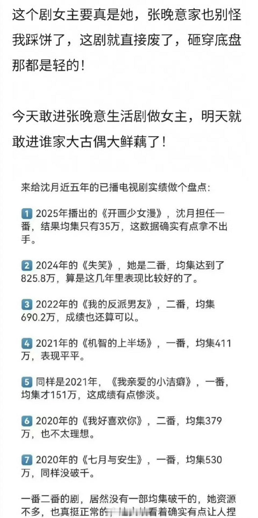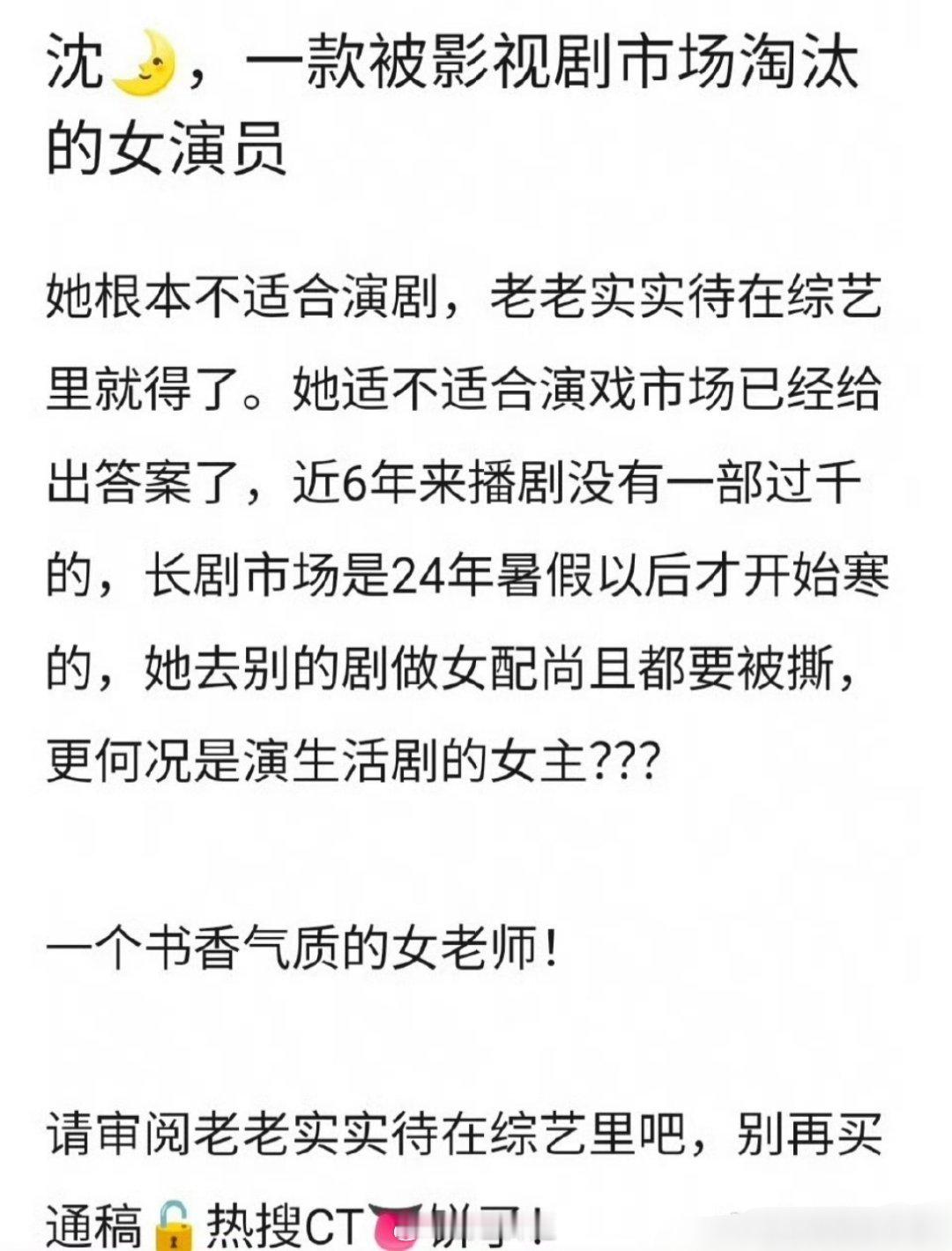 有网友发帖子称,沈月是一款被影视剧市场淘汰的女演员呢,她根本不适合演剧,老老实实呆在综艺里得了……