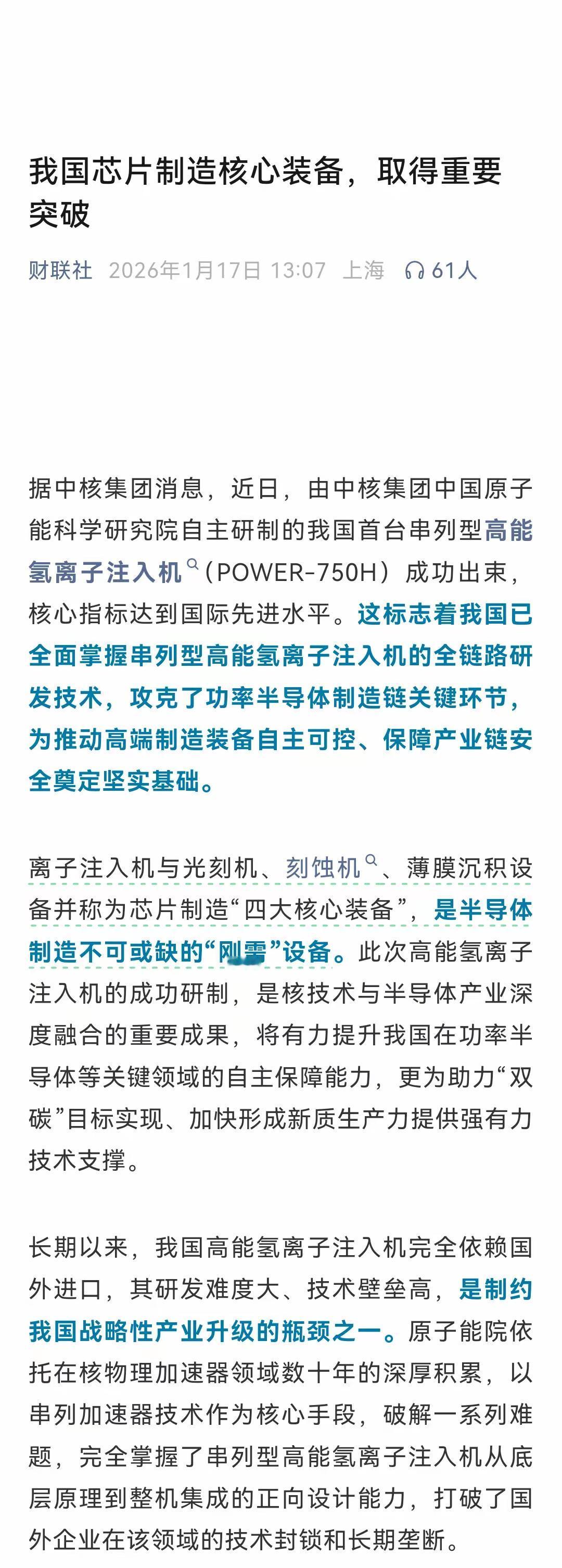 芯片圈大新闻!根据财联社1月17日报道,我国芯片行业再度获得重大突破,攻克了芯片制造四大核心设备之一的“离子注入机”,让“离子注入机”终于能够实现国产自主生产,彻底打破了国外在该领域的长期封锁和技术垄断。 很多人 只知光 刻,不知注 入机,其实它更关键,芯片制造四强,光刻 机画图,刻蚀机雕刻,薄膜沉积 镀膜,注入机是“注魂”,把硼磷砷,轰进硅片里,形成PN结,几十亿个开关,控制电流通断,没有它。芯片就是沙子 以前日子难过,美国应用材料,还有Axcelis,日本住友重工,这三家巨头,垄断全球九成,掌握绝对命门,咱们想买设备,得看别人脸色,一旦卡了脖子,生产线全停摆,如今扬眉 吐气,串列型高能,氢离子注入机,全流程自主,原理到整机。全是咱们中国造 这事意义重大,不仅是台机器,更是产业链安全,200万电子伏特,高能束流稳定,专攻高端芯片,功率半导体,未来不再受制,全产业链自主,拼图又补一块,从原子能院,到商业产线,技术硬核转化,国家队出手。果然非同凡响 网友热评: 1.学生党超骄傲!这波技术突破太提气,以后不用看别人脸色啦 2.太棒了!中核集团牛皮,不仅能造核电站,造芯片设备也是一把好手,这就是国家队实力 3.美 国制裁了个寂寞,越封锁我们越强,光刻机还会远吗 在本人看来,这消息太提气,科技就是硬道 理,虽然光刻机难,但我们在突围,从离子注入机,到刻蚀机突破,一步一个脚印,不再盲目崇拜,也不妄自菲薄,中国科研人员,确实值得 敬佩。这就是中国速度 中国芯崛起,势不可挡,打破所有魔咒。这事 你怎么看?