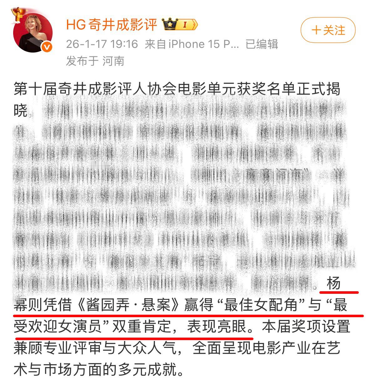 第十届奇井成影评人协会电影单元:恭喜杨幂《酱园弄·悬案》王许梅获得“最佳女配角”&“最受欢迎女演员”👏(好消息不断嘉奖不断呀~