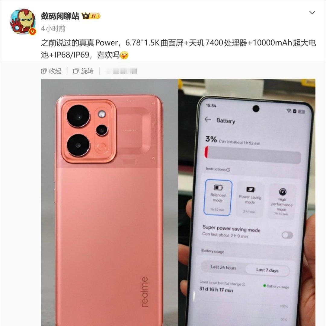 【realme 真我 Power 手机参数曝光:天玑 7400 处理器 +10000mAh 超大电池】博主 数码闲聊站 在微博曝光了真我 Power 手机的详细参数。博主表示,这台手机搭载 6.78 英寸 1.5K 曲面屏、联发科天玑 7400 处理器,拥有 10000mAh 超大电池,支持 IP68/IP69 防尘防水。后续有用户在评论区询问:“红红的万级大电池呢”,博主回复道:“打磨中”;另一名用户则表示:“好家伙,这边框控制居然意外的还不错,挺窄的”,博主则回复道:“放线下说不准会受欢迎……”。消息源“Лысый из МТ”曾在去年透露,一款型号为“RMX5107”的 realme 真我新机即将进入俄罗斯市场,搭载 10001 mAh 超大电池,相比荣耀 WIN 系列手机多出 1mAh,是 realme 品牌史上电池最大的手机。