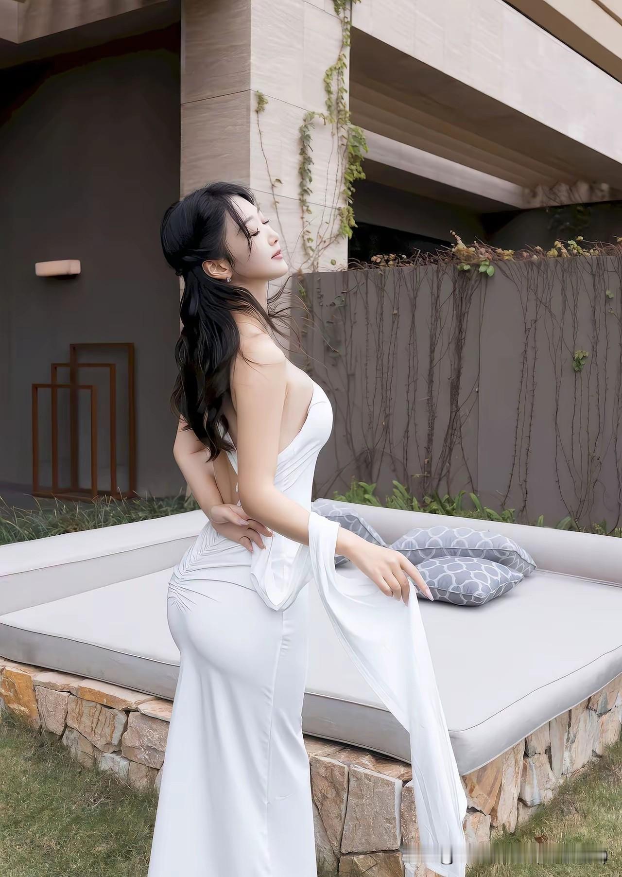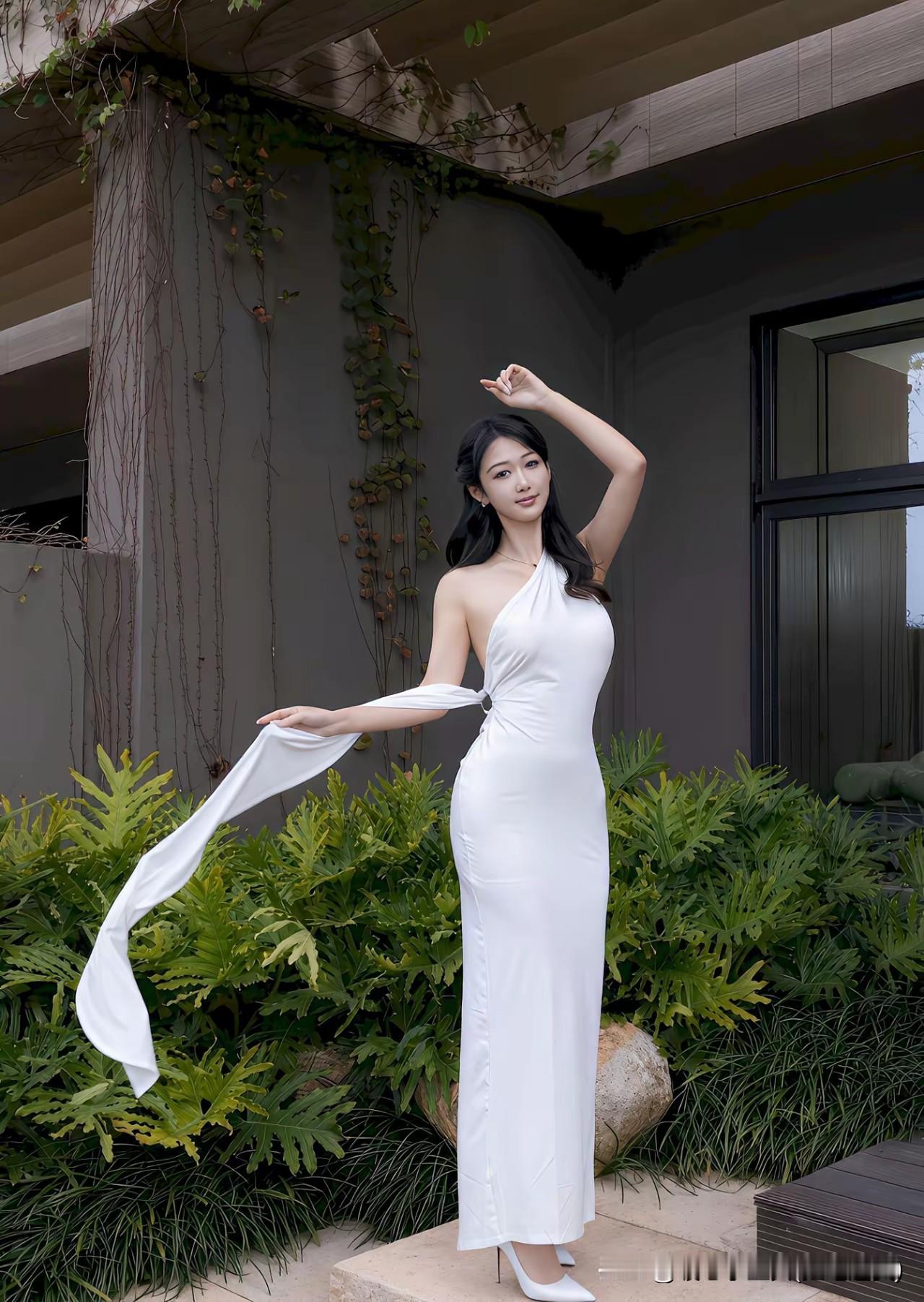 优雅白裙,绿植相伴,翩翩起舞,仙女之姿,尽显自然之美! 白衣白裙白玉女,请君对下联