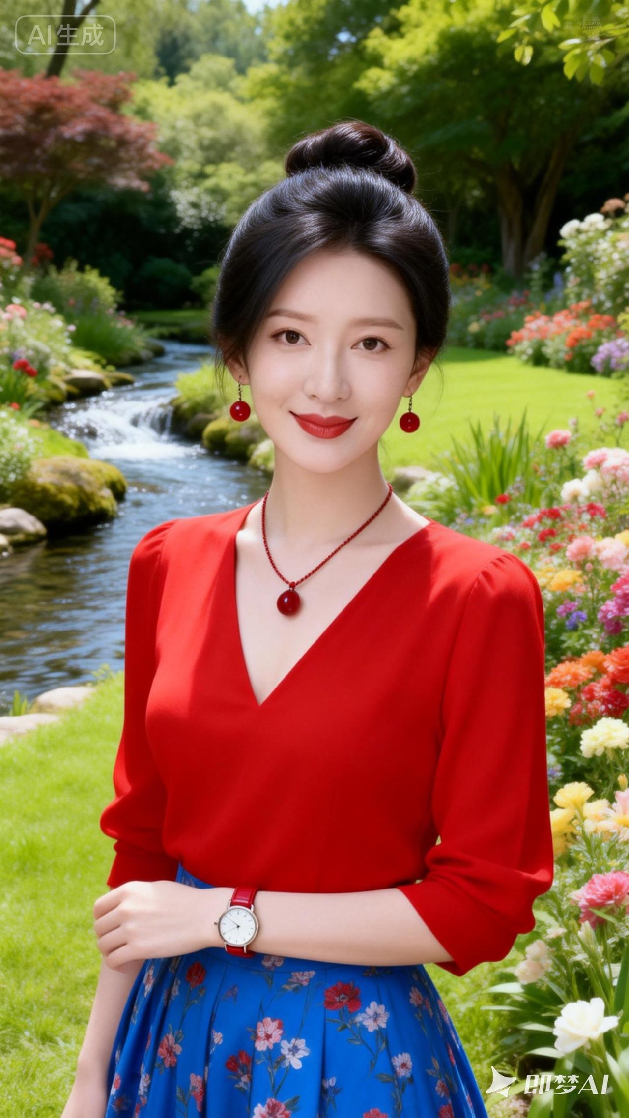 在花海中绽放,红裙与绿意相映成趣,自然与优雅并存。