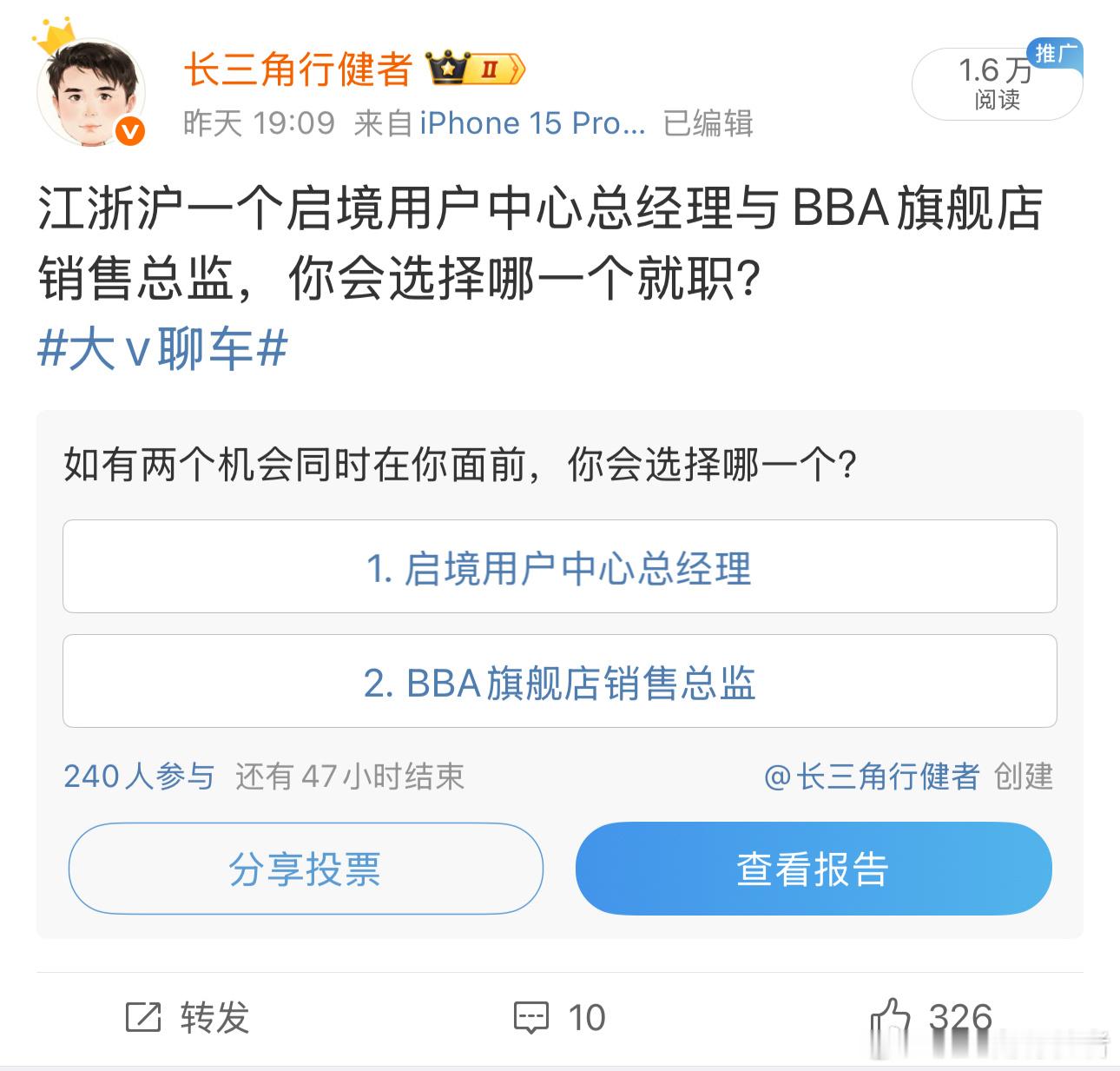 从昨天晚上到现在,24小时之内,有240个网友参与投票,其中59%选择启境用户中心总经理的岗位、41%选择BBA旗舰店销售总监的岗位。恰好刚刚也接到了这个候选人的电话,其选择留下来继续做BBA旗舰店销售总监,因为他后续有机会做店总,因此,不想去一个新地方迎接不确定性。恰好,也有一个网友下午也联系我,其如愿加入了“某境”主机厂的管理岗位,我也恭喜了他即将开始新旅程。正所谓“有人辞官归故里,有人星夜赶考场”,不同的人根据自身的状况、自己的判断选择适合自己的道路,最终接受自己选择带来的结果,不盲从于众口、为自己的选择努力,这样的职业生涯就是成功的。If not me, who?If not now, when?这个行业确实内卷,但这个行业的变革打破了原来的格局,造就了更多的机会、给更多年轻人选择的自由,这就是这个行业进步的标志之一。(模特胡兵都开始说车了,说明这个行业有多火)勇敢的前行就是人生的答案!大v聊车