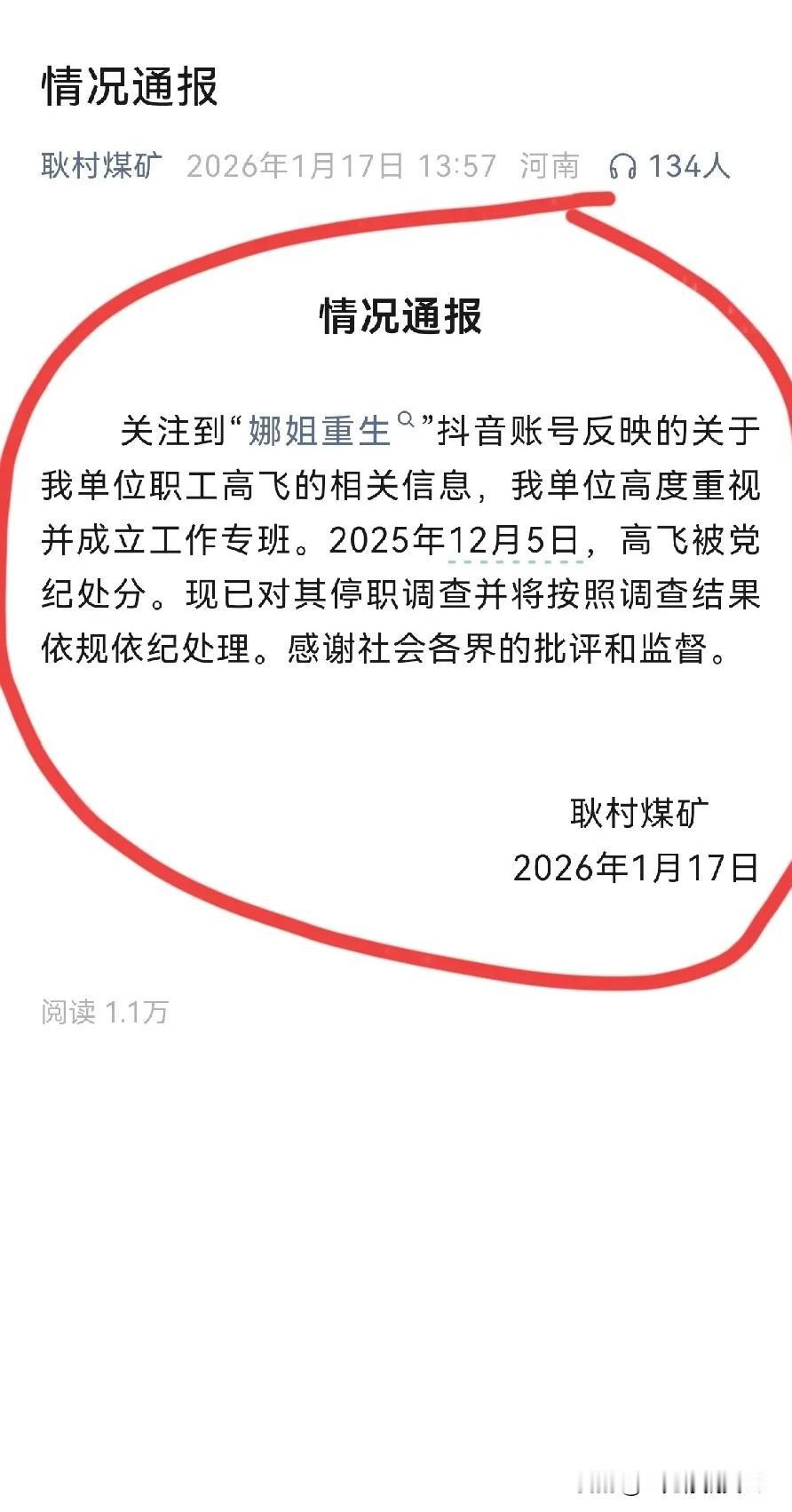 耿村煤矿终于出面了, 这下全国都知道高飞和韩润是真爱,没办法谁让你单位有名气,现在两口子都火了。 因为舆论压力,单位发布公告称已经成立工作专班对高飞进行停职调查。 之前牛娜不是去过单位吗?也是找了很久的单位才给她道了个歉,没办法舆论压力太大了。 不过说实话,飞润长相不错,身材也很好,跟牛娜一比显得两人还有夫妻相。