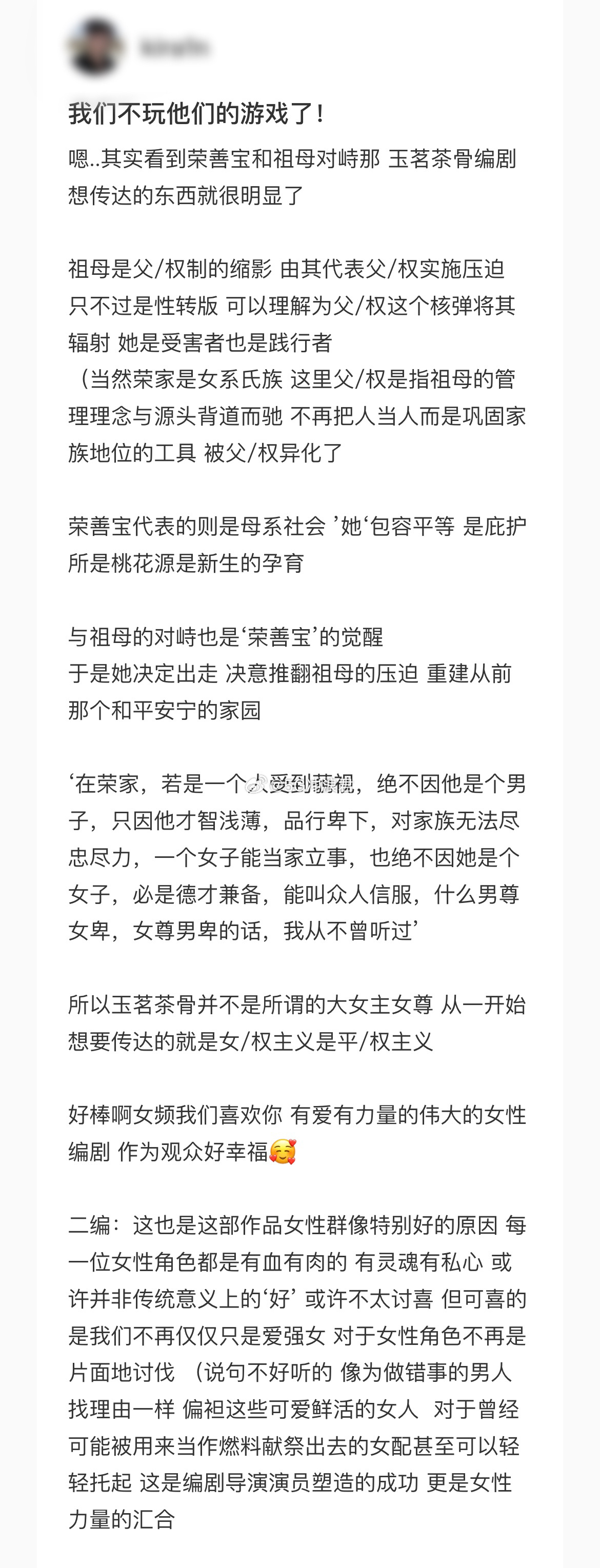玉茗茶骨伟大的女性编剧 故事最动人的是荣善宝对“家”的重新定义。家不再是需要效忠的抽象符号,而是给予每个具体的人以支持与成长的现实土壤。