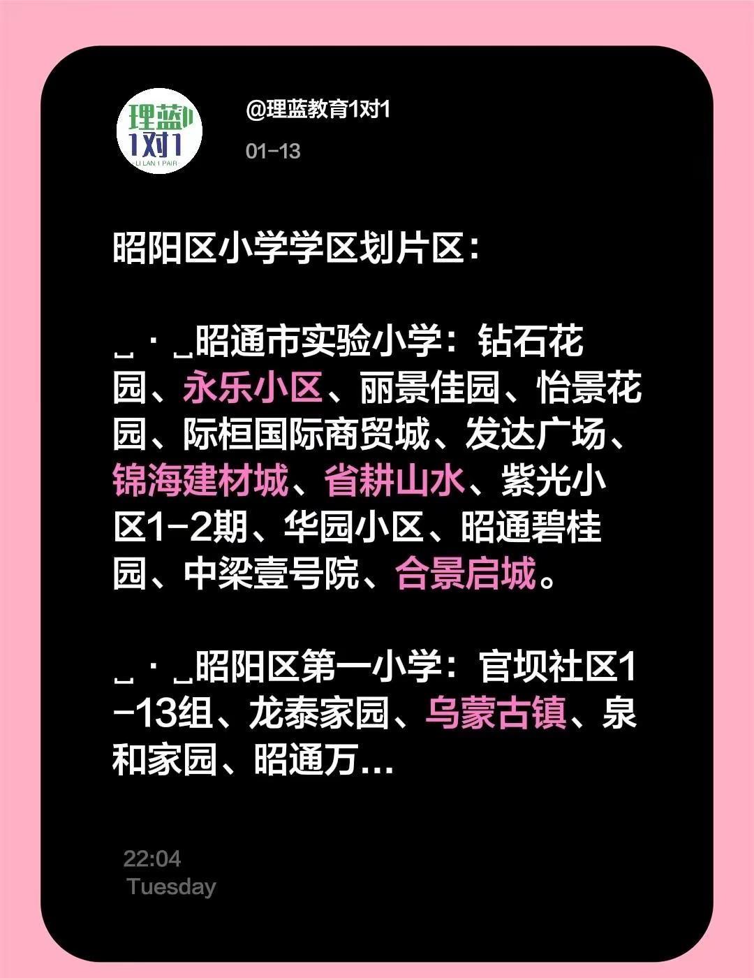 昭阳区小学学区划片区:昭通 昭阳区 •昭通市实验小学:钻石花园、永乐小区、丽景佳园、怡景花园、际桓国际商贸城、发达广场、锦海建材城、省耕山水、紫光小区1-2期、华园小区、昭通碧桂园、中梁壹号院、合景启城。•昭阳区第一小学:官坝社区1-13组、龙泰家园、乌蒙古镇、泉和家园、昭通万达广场城市综合体1期。•昭阳区第一小学北城校区:北正街单号1-157号、半边街单号、下排街、北顺城(单号1-103号、双号2-64号)、公园路单号63-157号、五福巷、新天地、秋城尚苑。•昭阳区第二小学:环北路电力二小区、龙泉路电力公司、复烤二厂、武警支队、老市检察院、市广电局、农机局、农机公司、皮革厂、复烤一厂、水利施工二队、市林业局、汽车总站、市食品公司、市运输公司、市气象局、李子园道班、北正街双号2-184号、龙泉路1-357号、环东路1-319号、小北门、环北路1-325号、兴盛街1-110号、龙泉社区、建设北街(双号2-234号)、龙泉新街、省耕塘巷、昭阳二十一世纪。•昭阳区第三小学本部及联盟校区:南菜园巷、联盟村、十五户、南顺城巷、昭阳大道(单号123-247号、双号194-218号)、西街、爱民路、政通路、北顺城(单号105-239号、双号66-200号)、北菜园、二甲街、兴隆街、南顺城至兴隆街口(单号1-39号、双号2-126号)、牛角湾、环西路、公园路下段(单号1-61号、双号2-104号)、殷家巷、明通巷、小石桥、环城北路327-385号、青年路、荷花路(2、4、6号)、海楼社区通贸街以北、正通润园、河滨康苑。