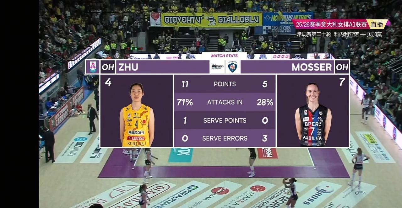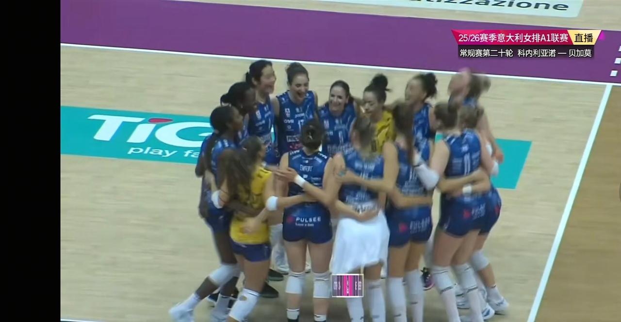 在今天凌晨结束的2025-2026赛季意甲女排联赛第20轮的一场比赛中,朱婷效力的科内利亚诺直落三局击败贝加莫继续领先积分榜,本场比赛,科内派出了朱婷在内的全部主力应战,最终以25:20、25:23、25:15赢得比赛的胜利,科内自由人德吉纳罗获本场MVP,值得一提的是朱婷本场比赛也发挥出色,不仅防守出色,进攻也屡屡得手,尤其是几次赏心悦目的大调功证明其实力还是强大,前两局结束后朱婷的进攻成功率高达71%,这个成功率真是令人赞叹不已啊!朱婷全场拿下15分,虽然MVP没颁给她,但球迷心中她也是MVP。