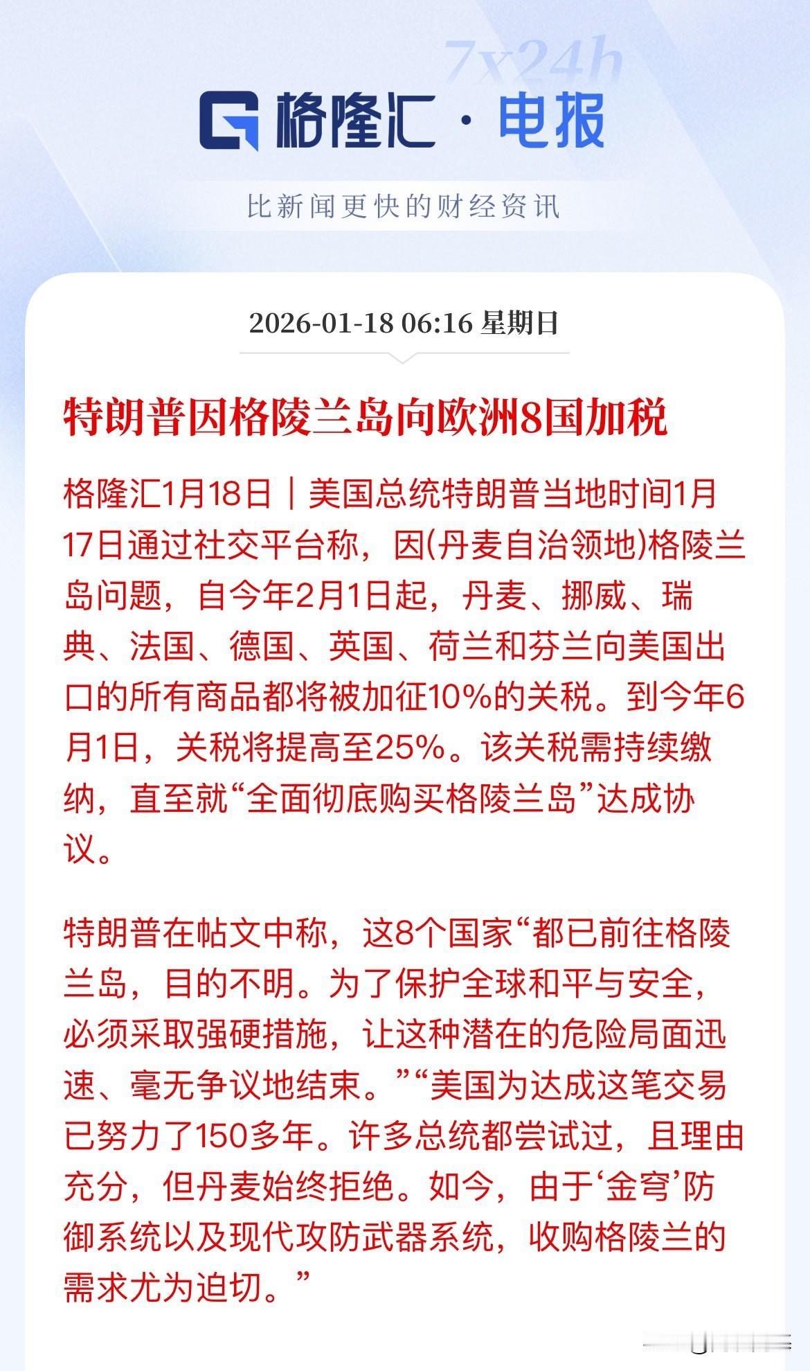 开始整活了,从喊话威逼到经济胁迫,还不服从就直接开抢,现在的流程基本上都是这样,简单粗暴呢,就问:给不给,不给直接明抢 特朗普说欧洲8国派人去格陵兰岛,不知道他们要干什么,为维护全球和平和安全,这高位提升,这格局,避免他们搞小动作,然后对这八国直接征25%关税,从6月1日开始,分别是:丹麦、挪威、瑞典、法国、德国、英国、荷兰和芬兰。