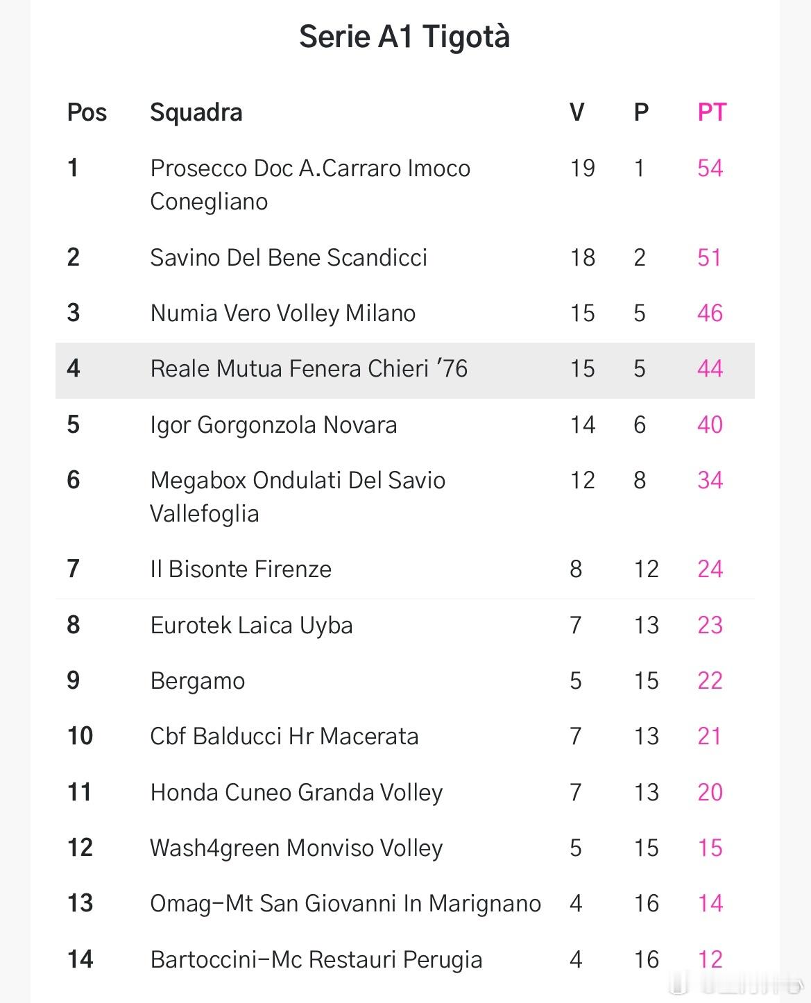 【意甲女排联赛20轮赛况】科内利亚诺3-0贝加莫圣乔瓦尼3-0库内奥布斯托3-0马切拉塔佛罗伦萨3-0佩鲁贾米兰3-1蒙维索斯坎迪奇3-2诺瓦拉基耶里3-0瓦莱福利亚世界女排新闻庄宇珊留洋第一季朱婷留洋第七季