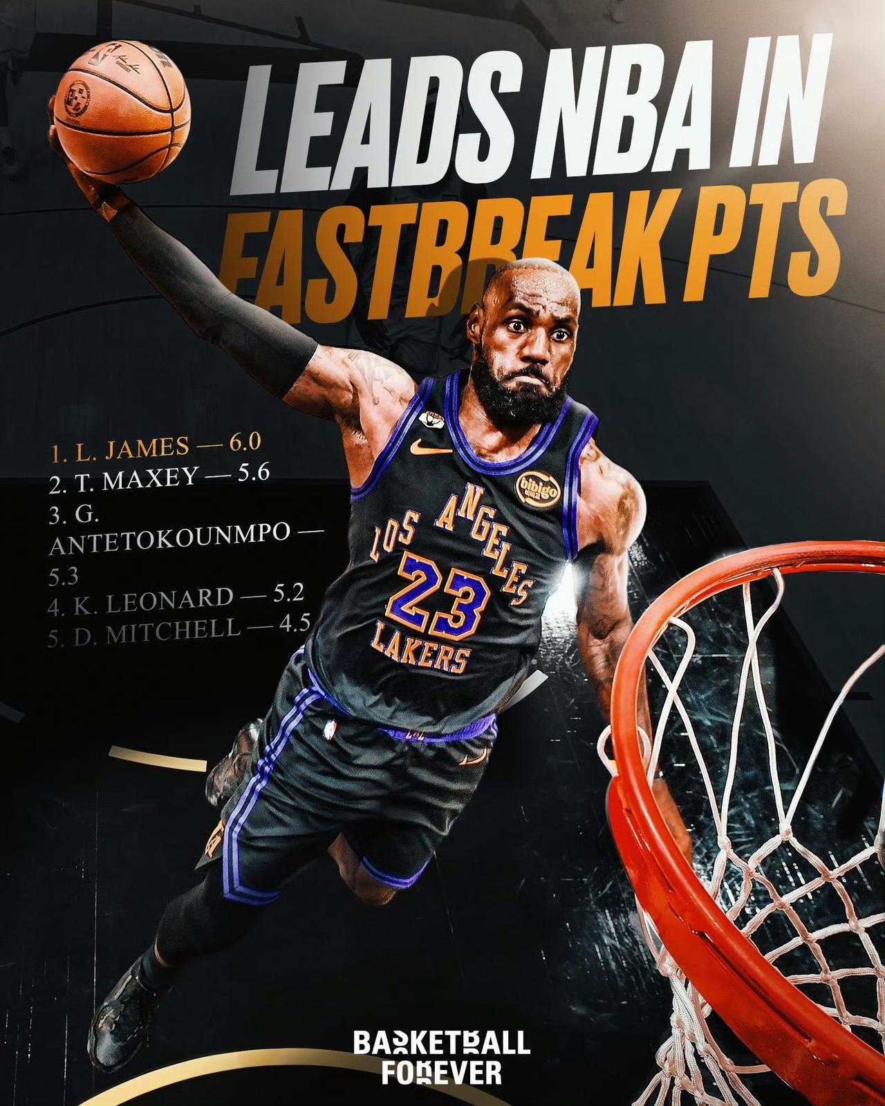 勒布朗·詹姆斯的又一神迹——在41岁的“高龄”,他以场均6.0分的快攻得分领跑全联盟,把一众正值巅峰的后卫、前锋都甩在了身后。 1. 勒布朗·詹姆斯(洛杉矶湖人):6.0分 2. 泰雷斯·马克西(费城76人):5.6分 3. 扬尼斯·阿德托昆博(密尔沃基雄鹿):5.3分 4. 科怀·伦纳德(洛杉矶快船):5.2分 5. 多诺万·米切尔(克利夫兰骑士):4.5分