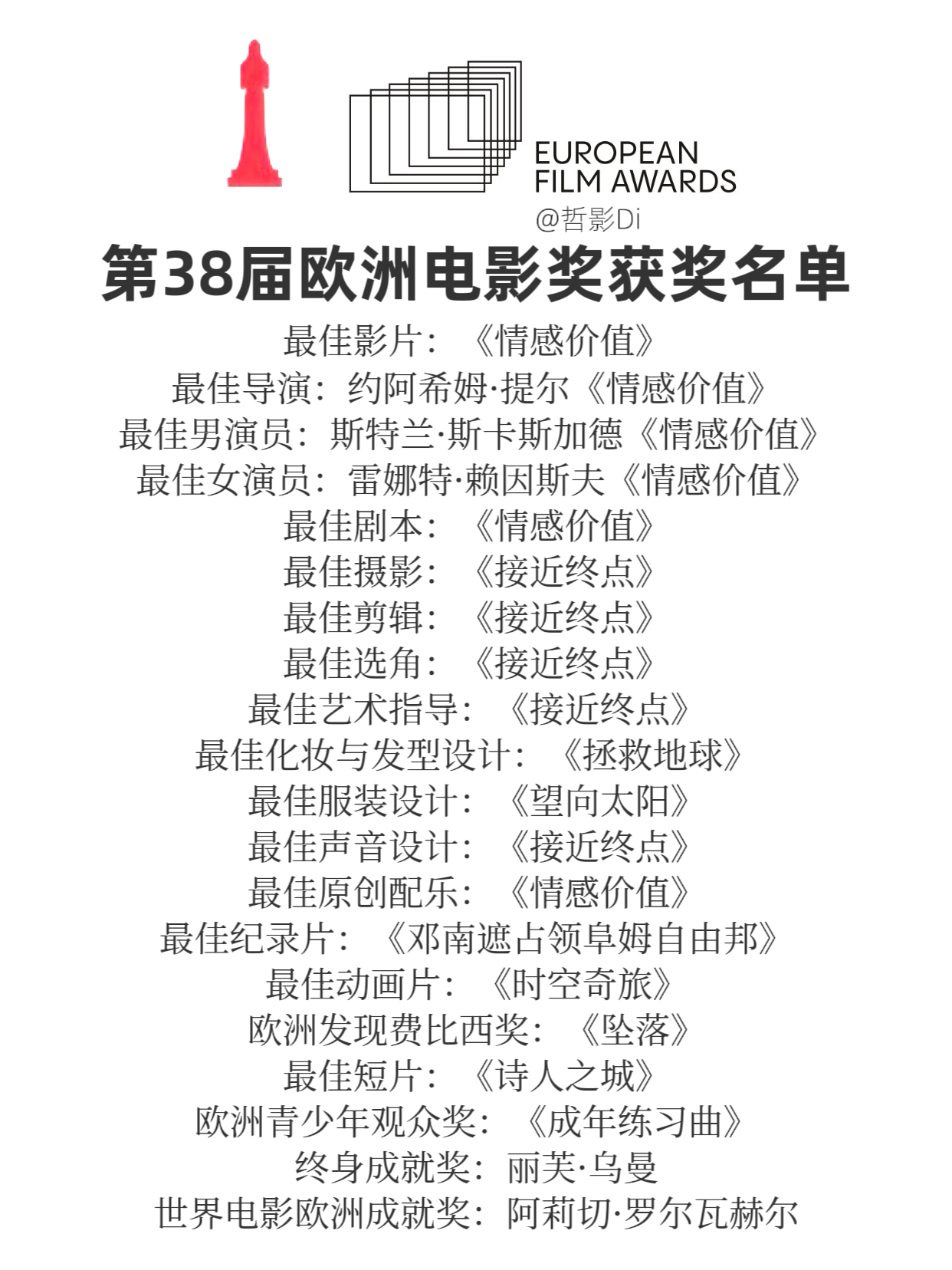 第38届欧洲电影奖获奖名单公布,影片《情感价值》横扫最佳影片、最佳导演、最佳男女演员在内的六项大奖成为最大赢家,《接近终点》则获得最佳摄影等五项大奖紧随其后。斯特兰·斯卡斯加德继获得金球奖最佳男配角之后获得欧洲电影奖影帝,对于获得奥斯卡又多了几分胜算。而戛纳影后雷娜特·赖因斯夫则首次获得欧洲电影奖影后,这或许能让她在演员奖掉提的情况下获得奥斯卡提名。