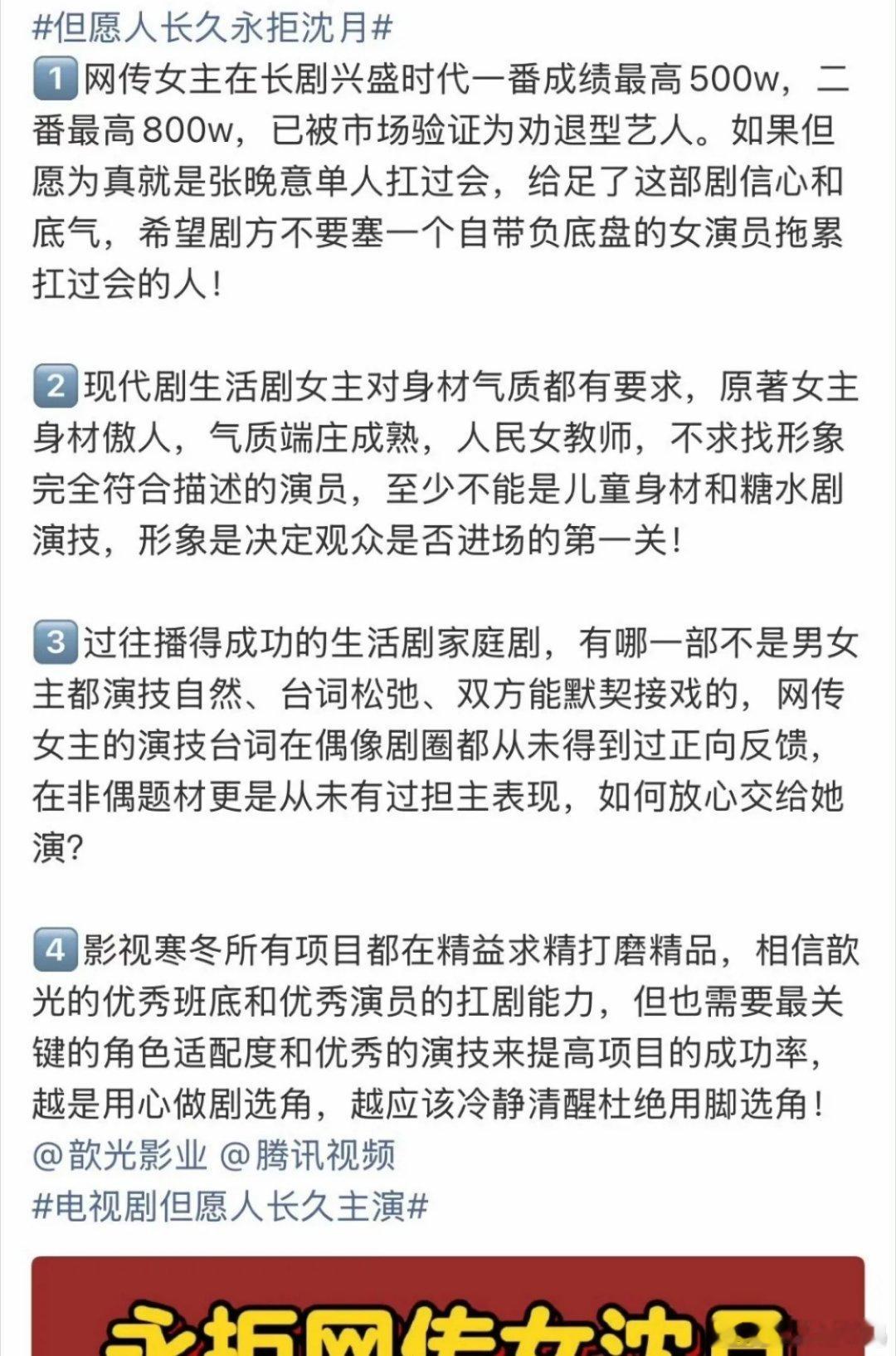 张晚意粉丝这阵仗挺大啊,直接在微博上要求《但愿人长久》剧组把沈月换掉,说她会拖张晚意后腿。其实粉丝有意见也能理解,毕竟之前网传的女主是马思纯,从影后换成偶像剧女主,这落差确实有点大。粉丝主要觉得沈月之前的作品成绩不算突出,怕她扛不起剧,跟张晚意搭不到一块儿去。不过我瞅着这搭配倒挺新鲜的。张晚意之前合作的王楚然、景甜、孙怡,都是那种气质大美女,沈月就不一样了,是邻家甜妹挂的。张晚意到现在也没出过特别火的CP,说不定跟沈月搭能撞出不一样的火花呢?