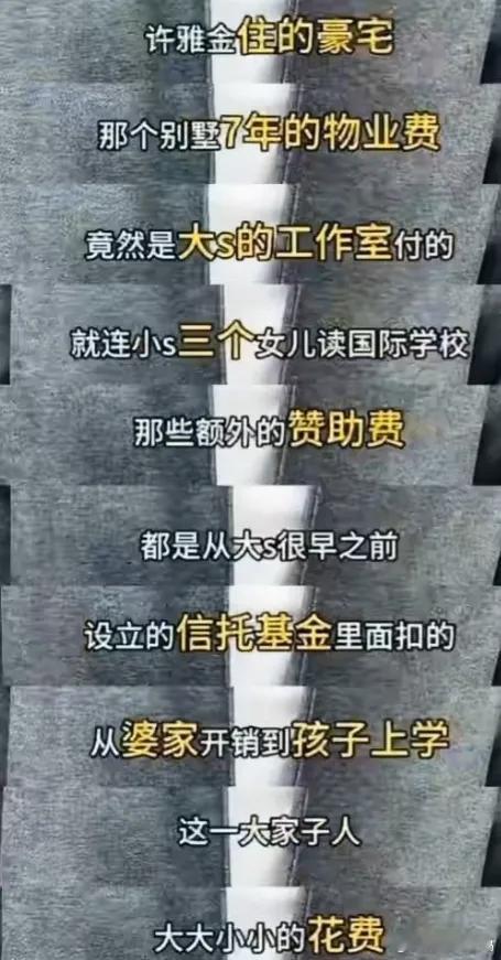 汪小菲和S家要重启谈判也算是可喜可贺的一件事情了,只不过这其中的曲折是真的让人难以相信,大S在世的时候不仅是“扶娘家魔”,还是“扶妹妹婆家魔”,或许S妈都不知道,大S不仅养她还有小S的女儿上学费各种费用,加上大姐一家,再加上一颗卤蛋,包括大S自己在内这么一大家子尽情的挥霍谁养得起?怪不得大s生前要一个劲的告汪小菲要钱!!!