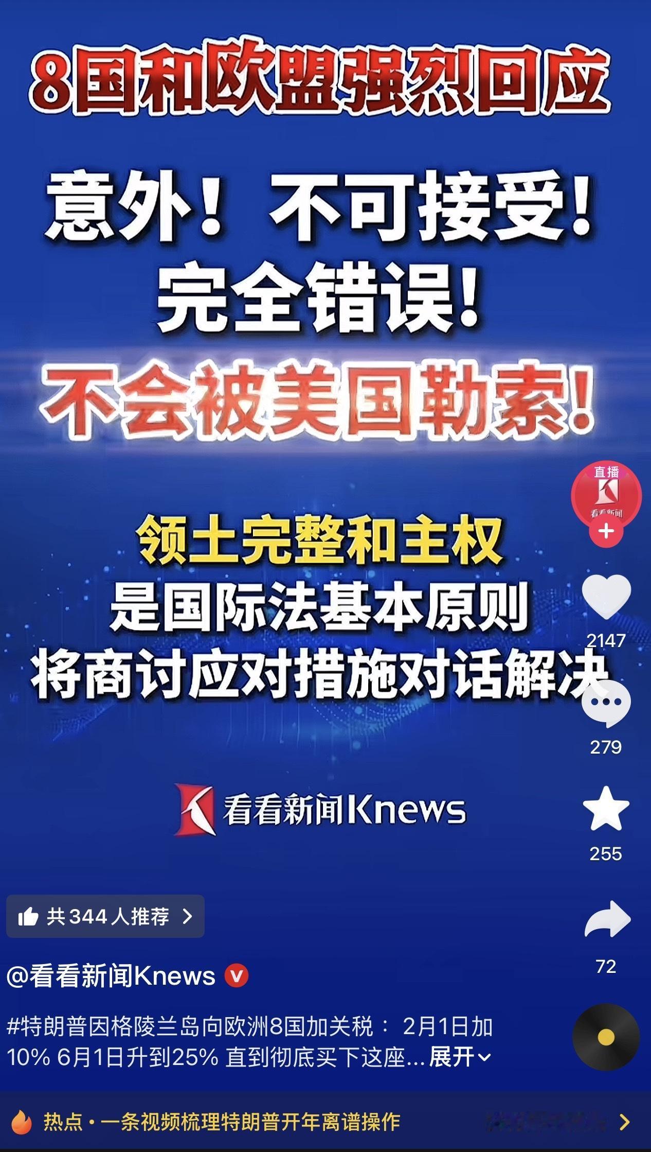 特朗普像欧洲八国加关税! 这回理解为啥欧洲多国往格陵兰派兵派37个人了吧!不派吧,不人道!派吧,有关税!所以象征性的派,一个,两个的,最多15个!但是结果还是一样的加关税! 咱就说就非得和美国来往,非得和他做买卖,心甘情愿被拿捏?那不是该吗?! 曾经怎么着也是欧洲列强啊!现在美国小跟班!真怂!欧洲可以改名中东了![抠鼻][抠鼻][抠鼻][抠鼻]