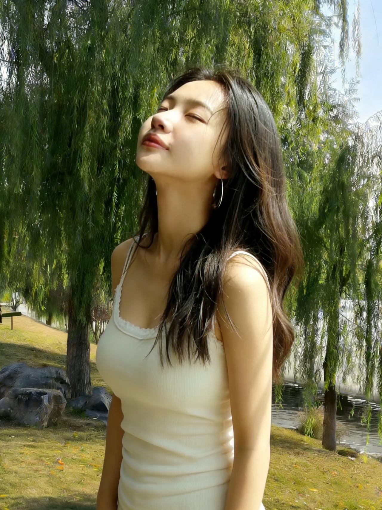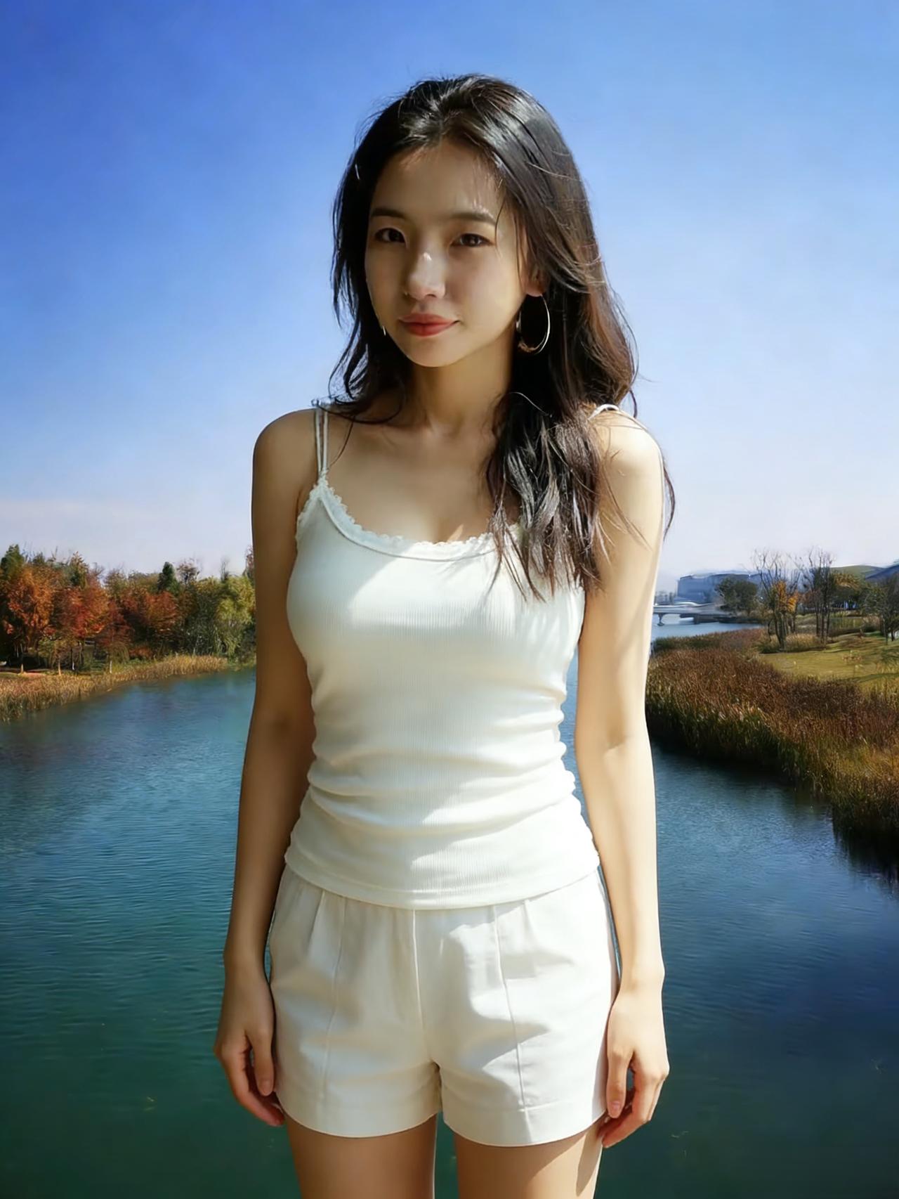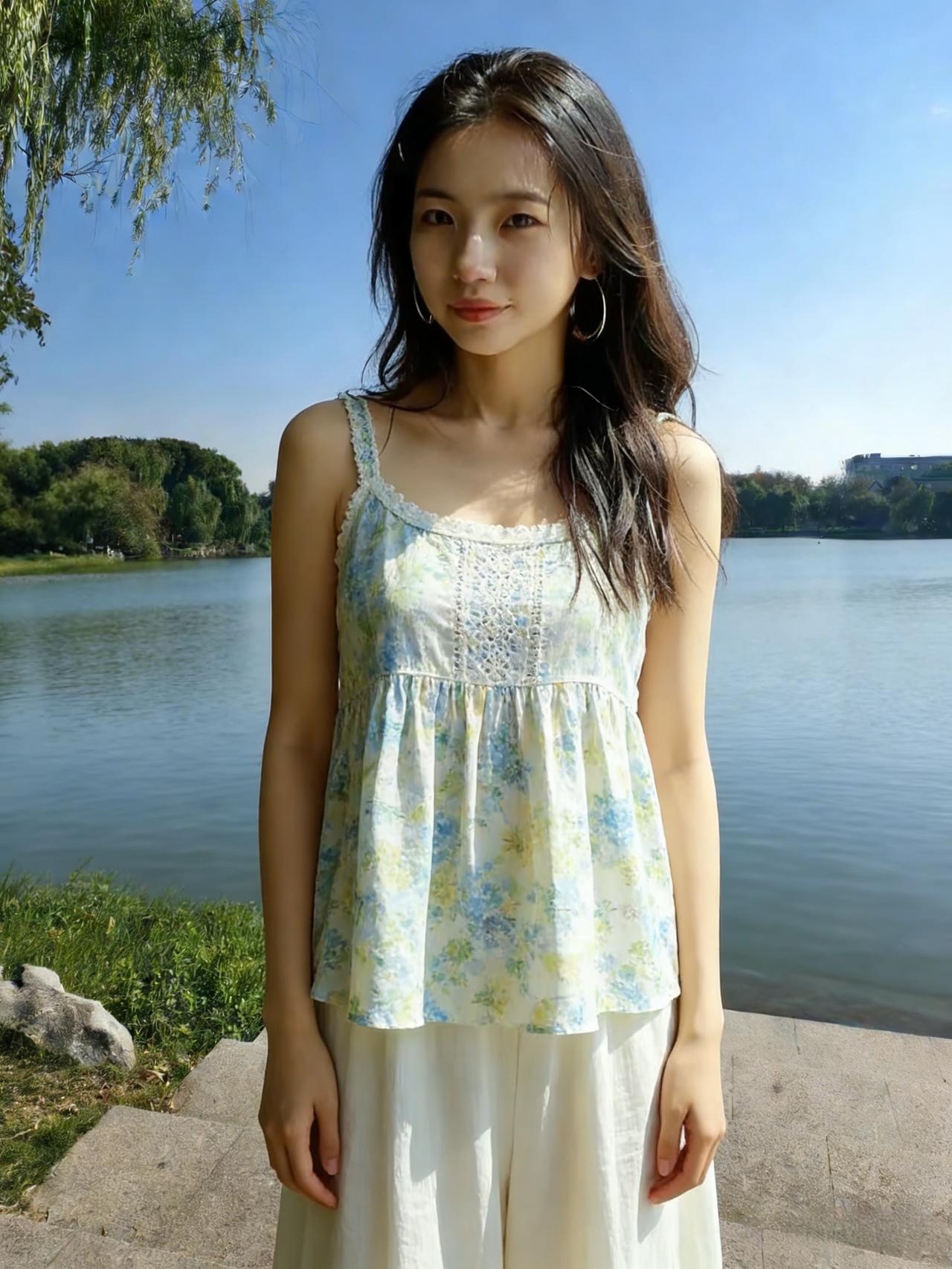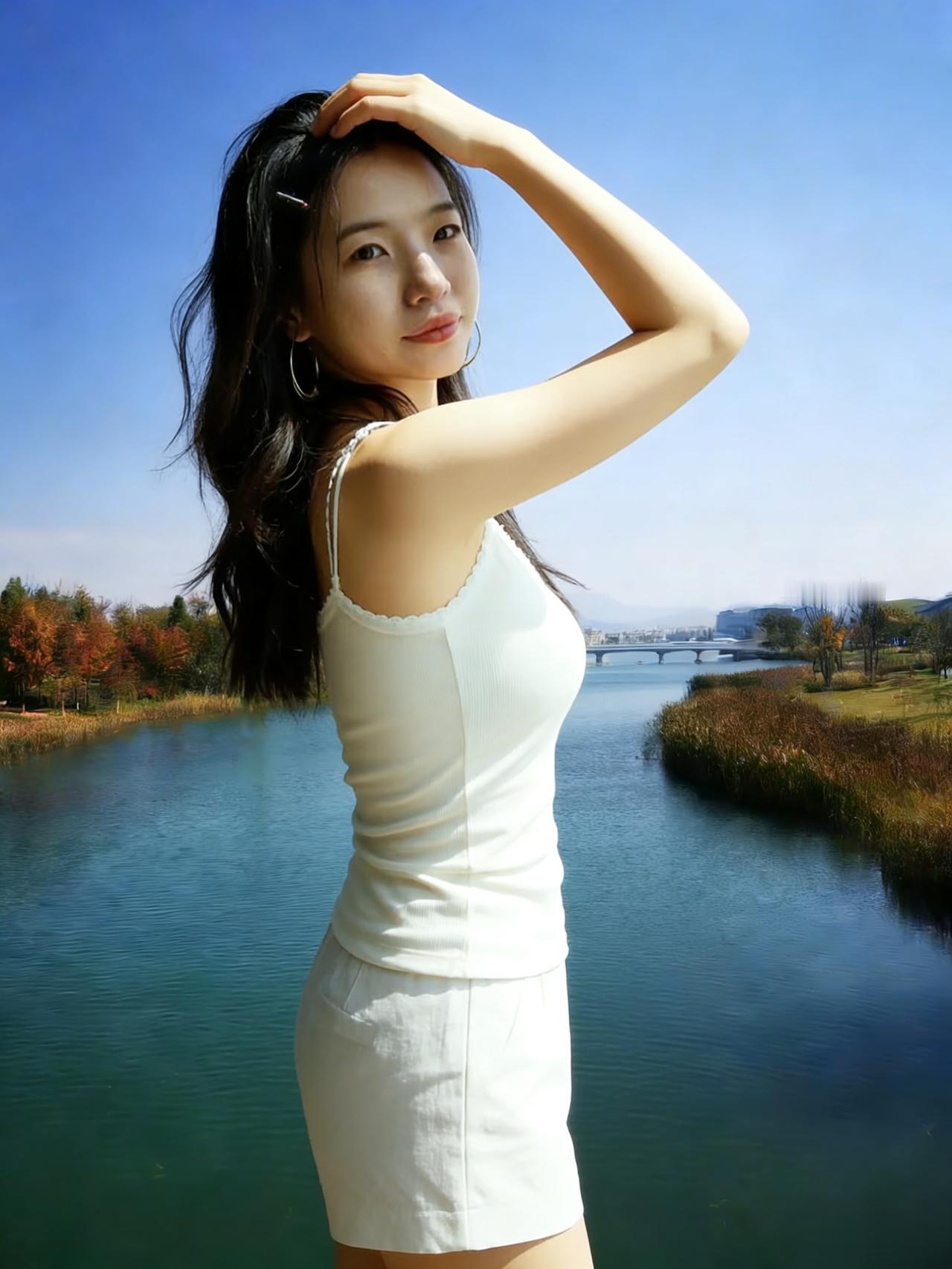 她是河畔最先接住晨光的人 风穿过白吊带的蕾丝边 把影子揉进波纹里 桥在远处卧成一条安静的线 她抬手掠发时 整个秋天的蓝都落进眼底 ~ 柳丝垂落如绿色的纱幔 闭眼的瞬间 阳光在锁骨上跳成细碎的星 身后的芦苇荡 正把季节的私语 织成毛茸茸的金黄 ~ 高楼的棱角被风软化 碎花布衫漫开彩色的云 她站在那里 不说话 就成了所有风景的句号 等暮色漫过肩头 才惊觉 我们都在她的温柔里 走了好远好远