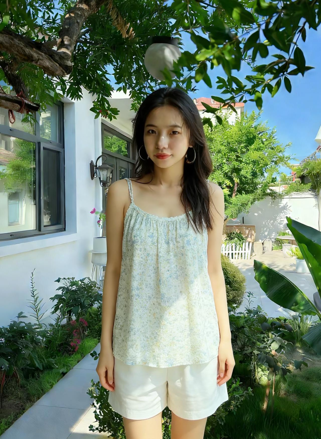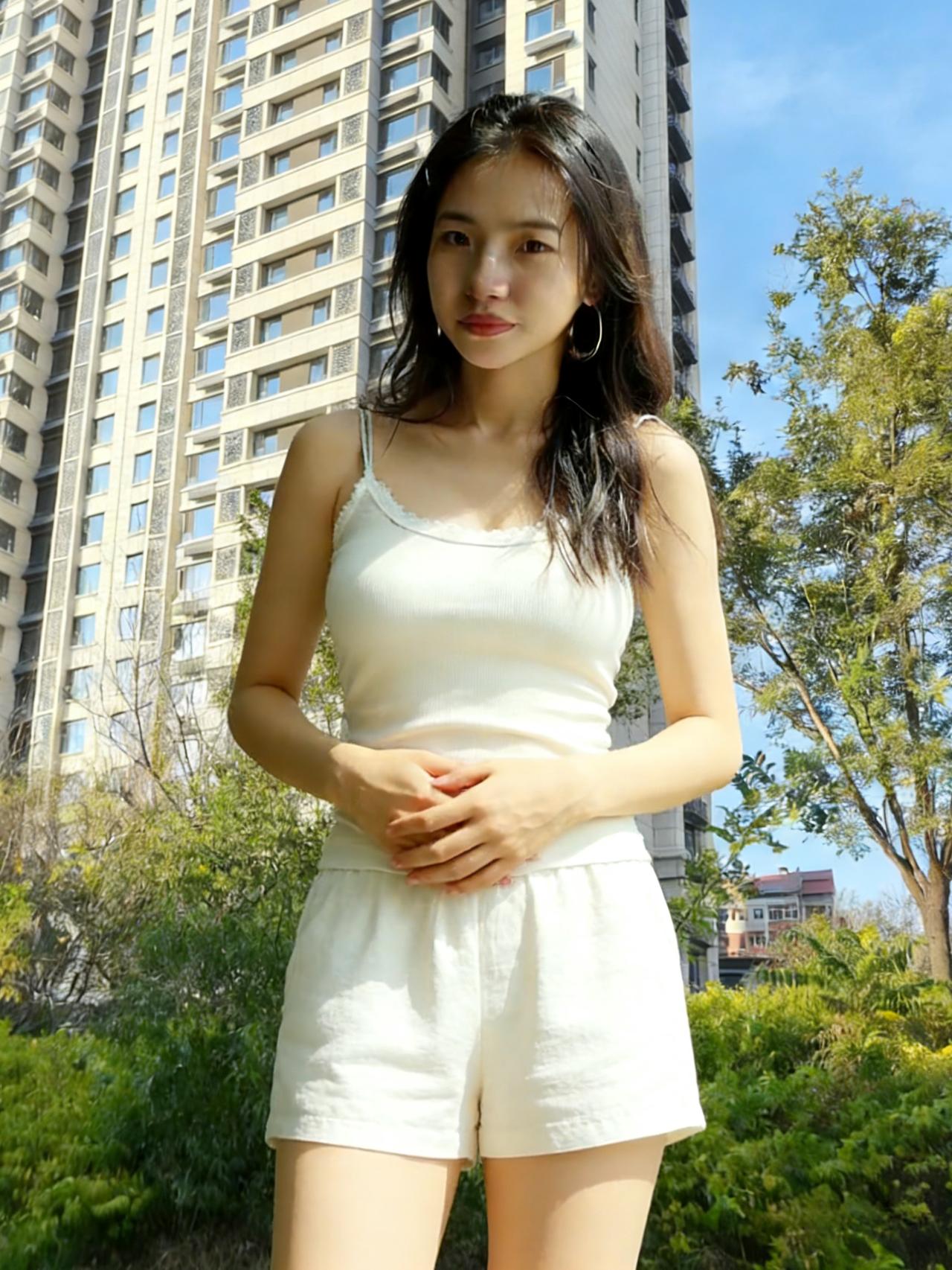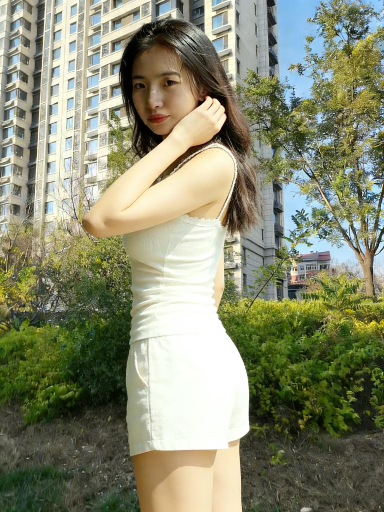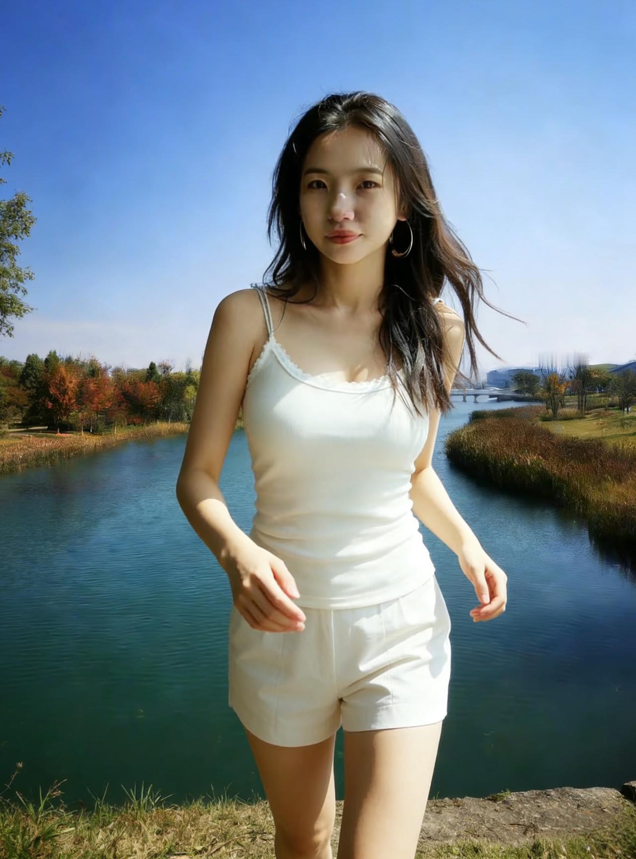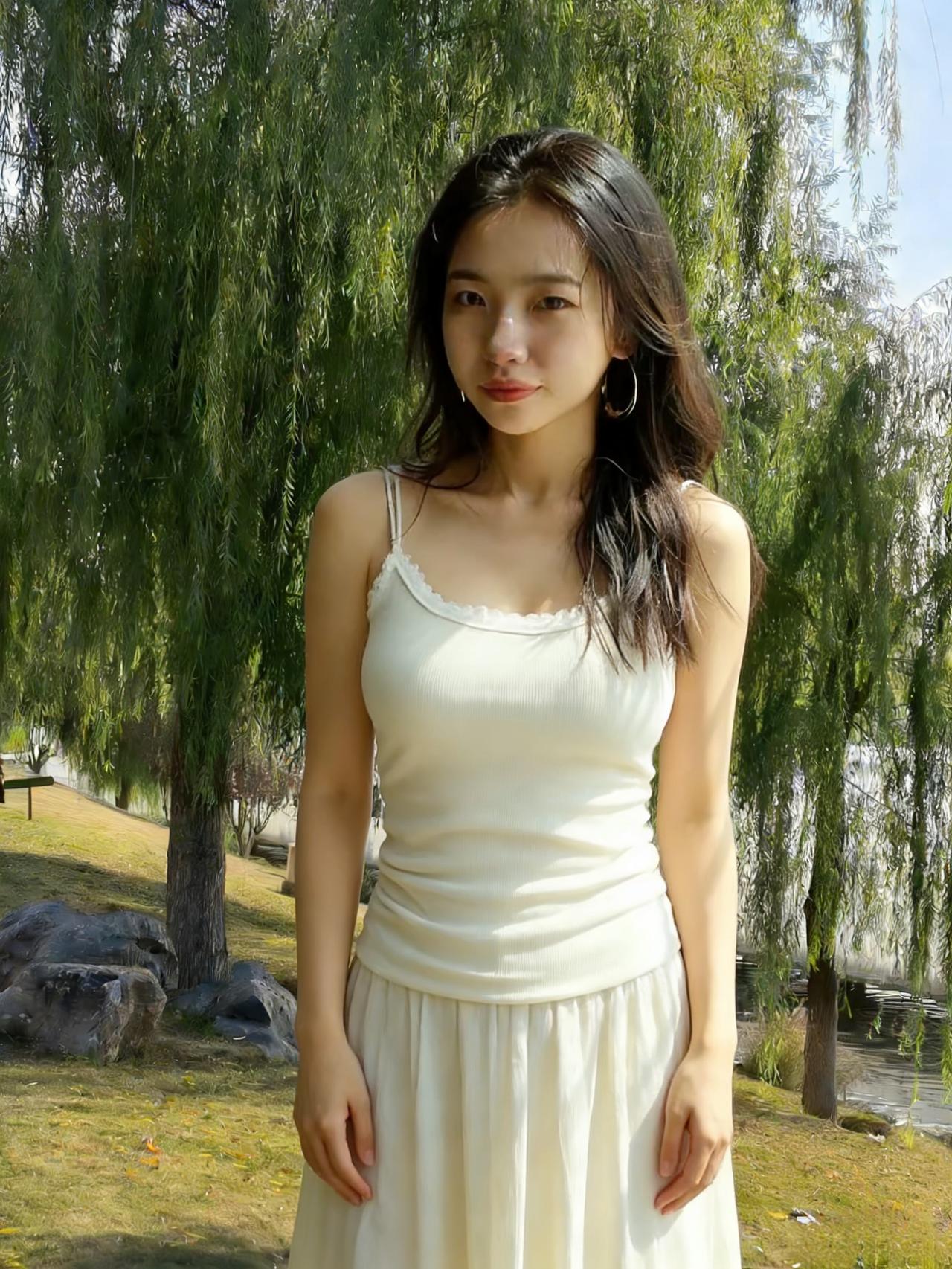 她是河畔最先接住晨光的人 风穿过白吊带的蕾丝边 把影子揉进波纹里 桥在远处卧成一条安静的线 她抬手掠发时 整个秋天的蓝都落进眼底 ~ 柳丝垂落如绿色的纱幔 闭眼的瞬间 阳光在锁骨上跳成细碎的星 身后的芦苇荡 正把季节的私语 织成毛茸茸的金黄 ~ 高楼的棱角被风软化 碎花布衫漫开彩色的云 她站在那里 不说话 就成了所有风景的句号 等暮色漫过肩头 才惊觉 我们都在她的温柔里 走了好远好远