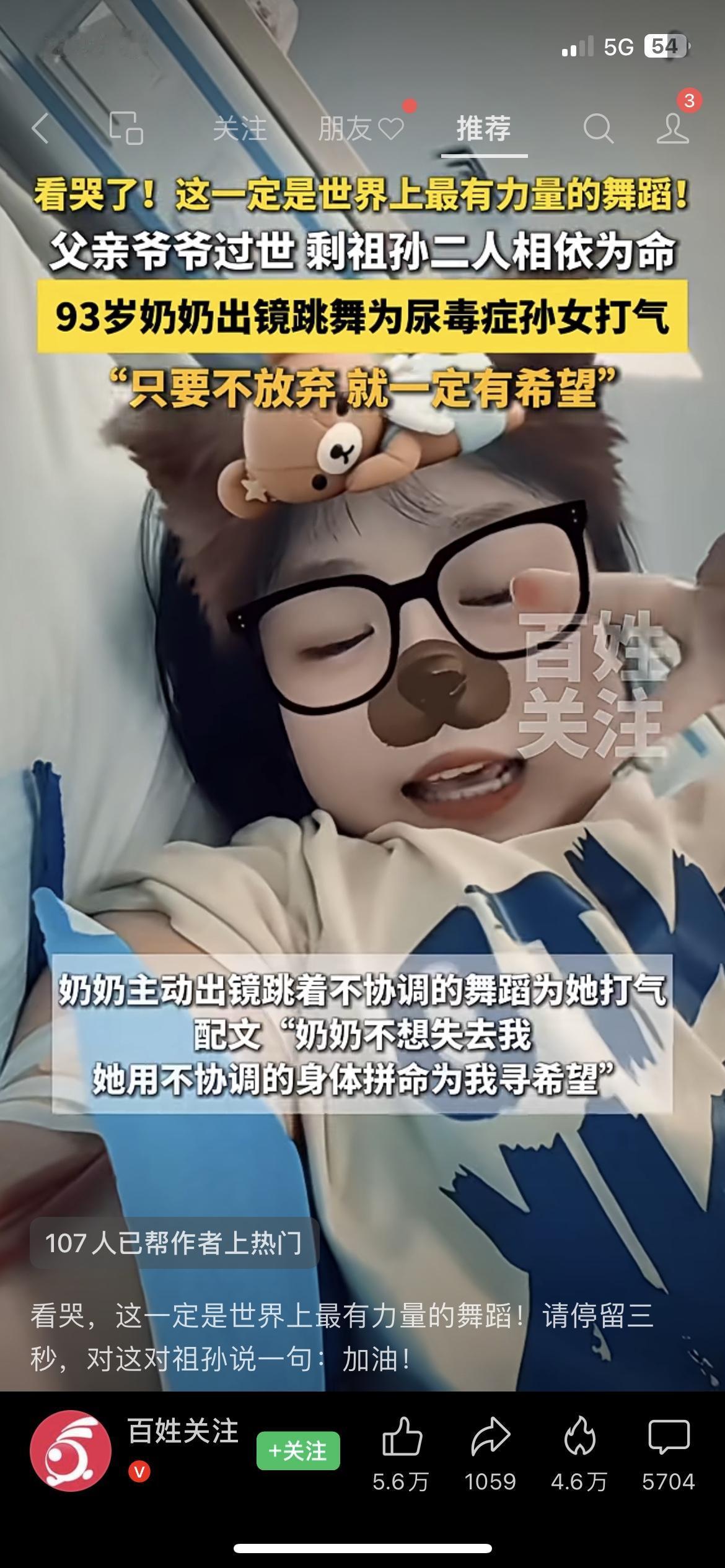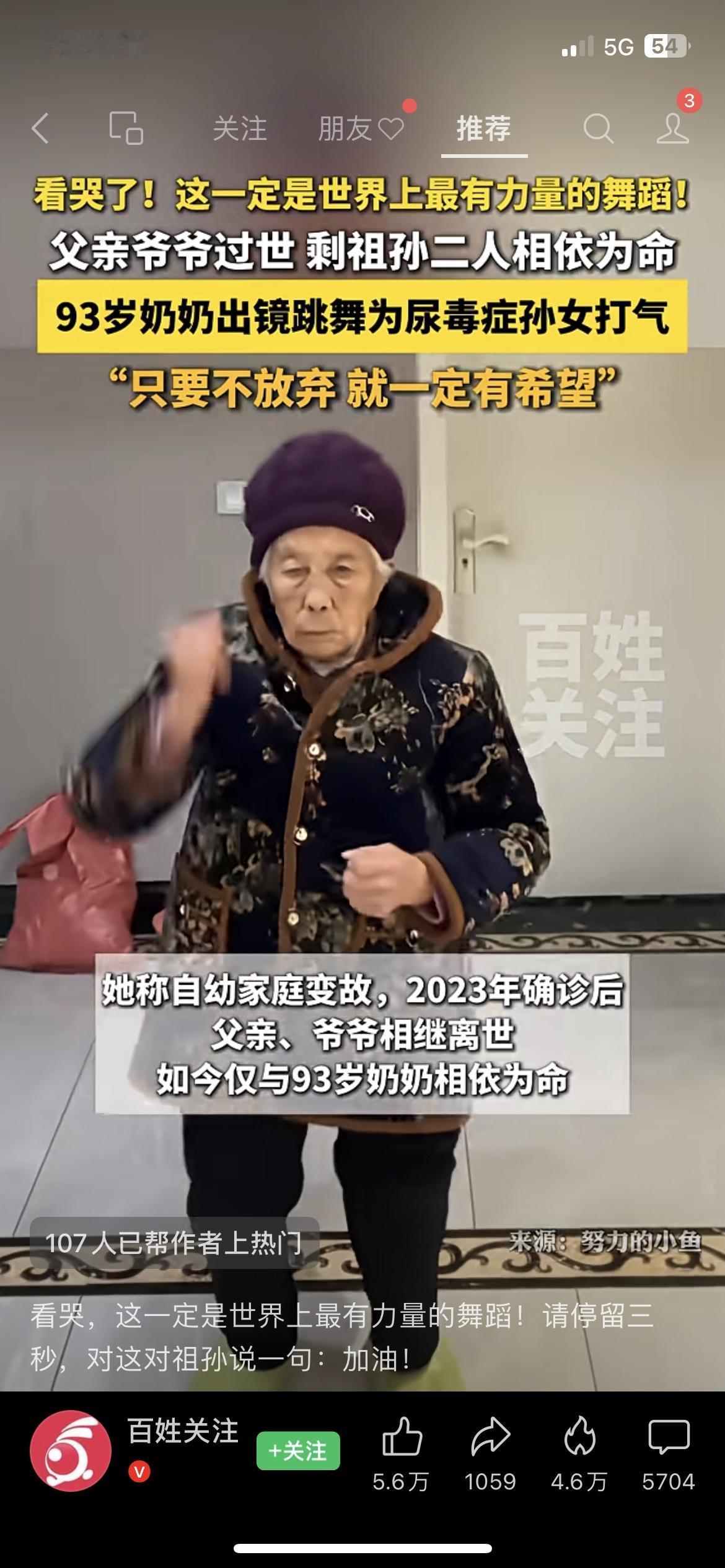 93岁奶奶为尿毒症孙女跳舞打气 看哭了!这是世界上最有力量的舞蹈💔 父亲和爷爷相继离世,只剩祖孙二人相依为命,93岁的奶奶用不协调的舞步为尿毒症孙女打气:“只要不放弃就一定有希望”。 奶奶笨拙的动作里,是沉甸甸的爱与不放弃的信念。 奶奶的舞步,是对抗命运的力量。你想对这对祖孙说一句什么话? 祖孙情 正能量