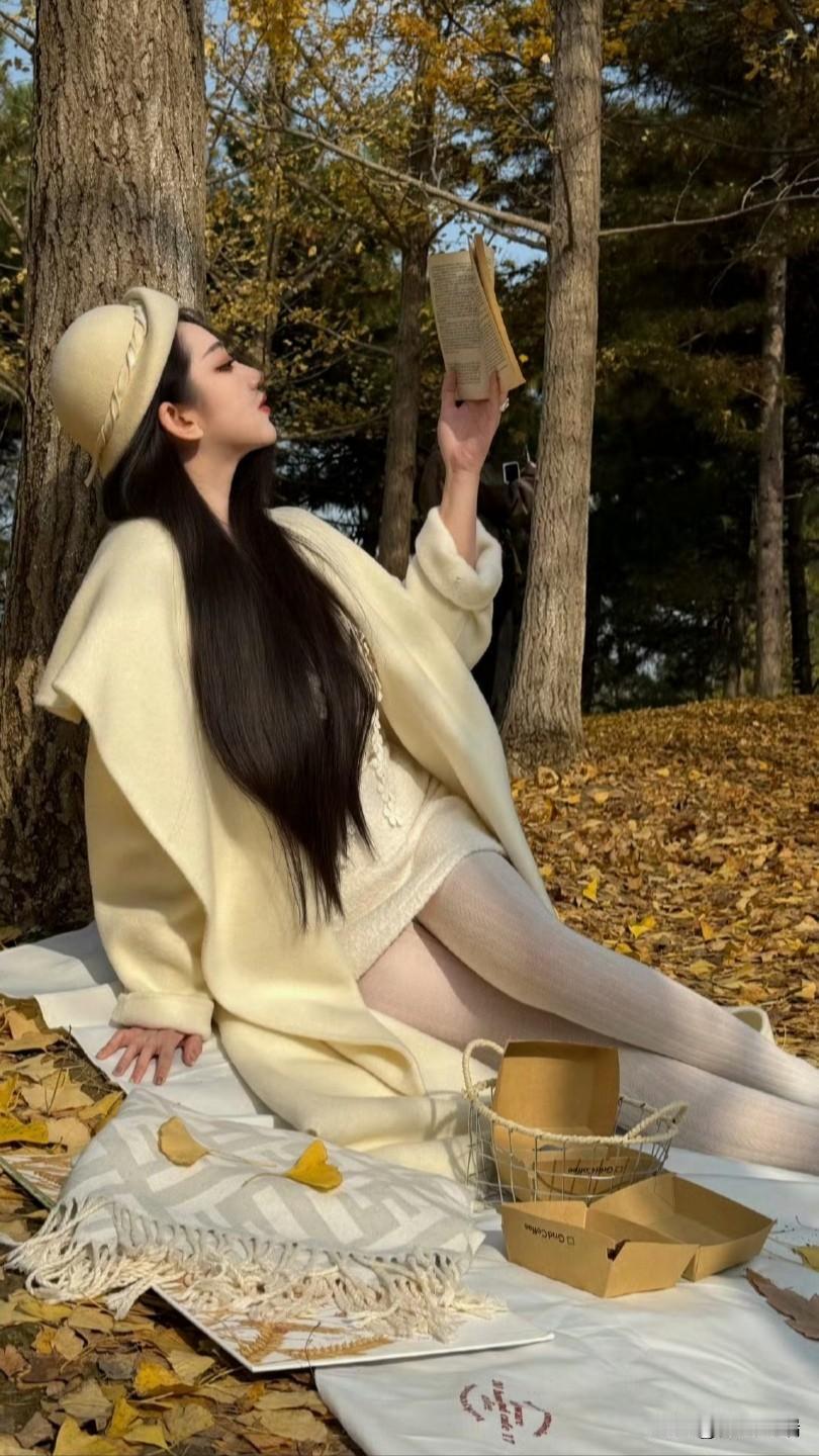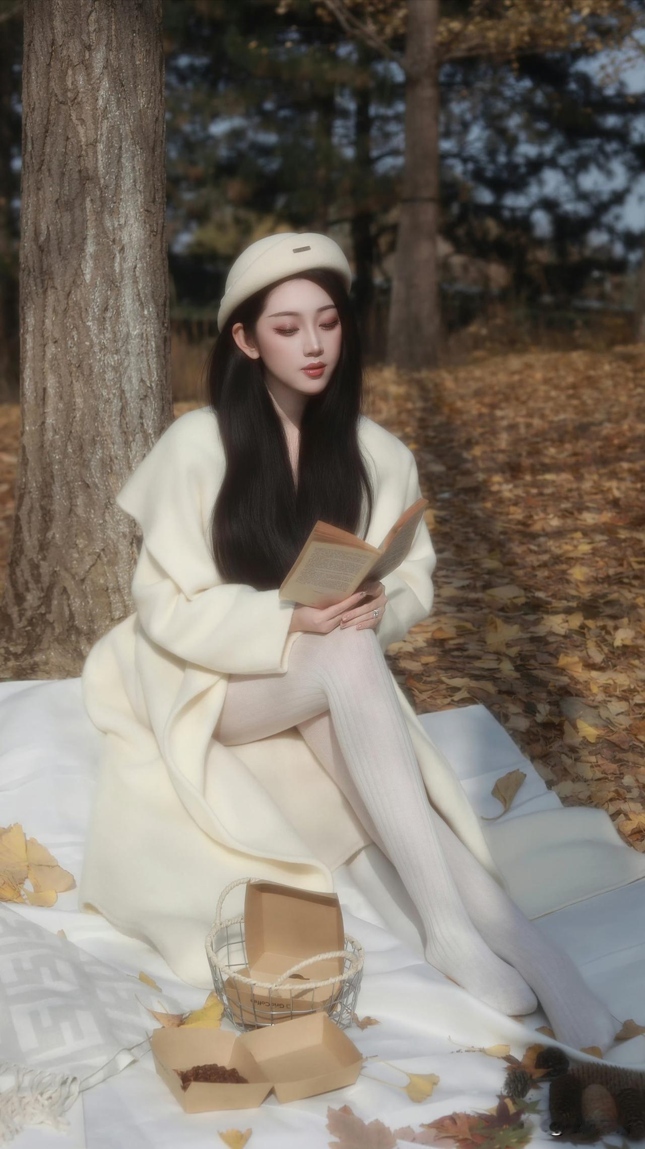 秋日森林中的温柔女子,暖阳洒落,如梦如幻。
