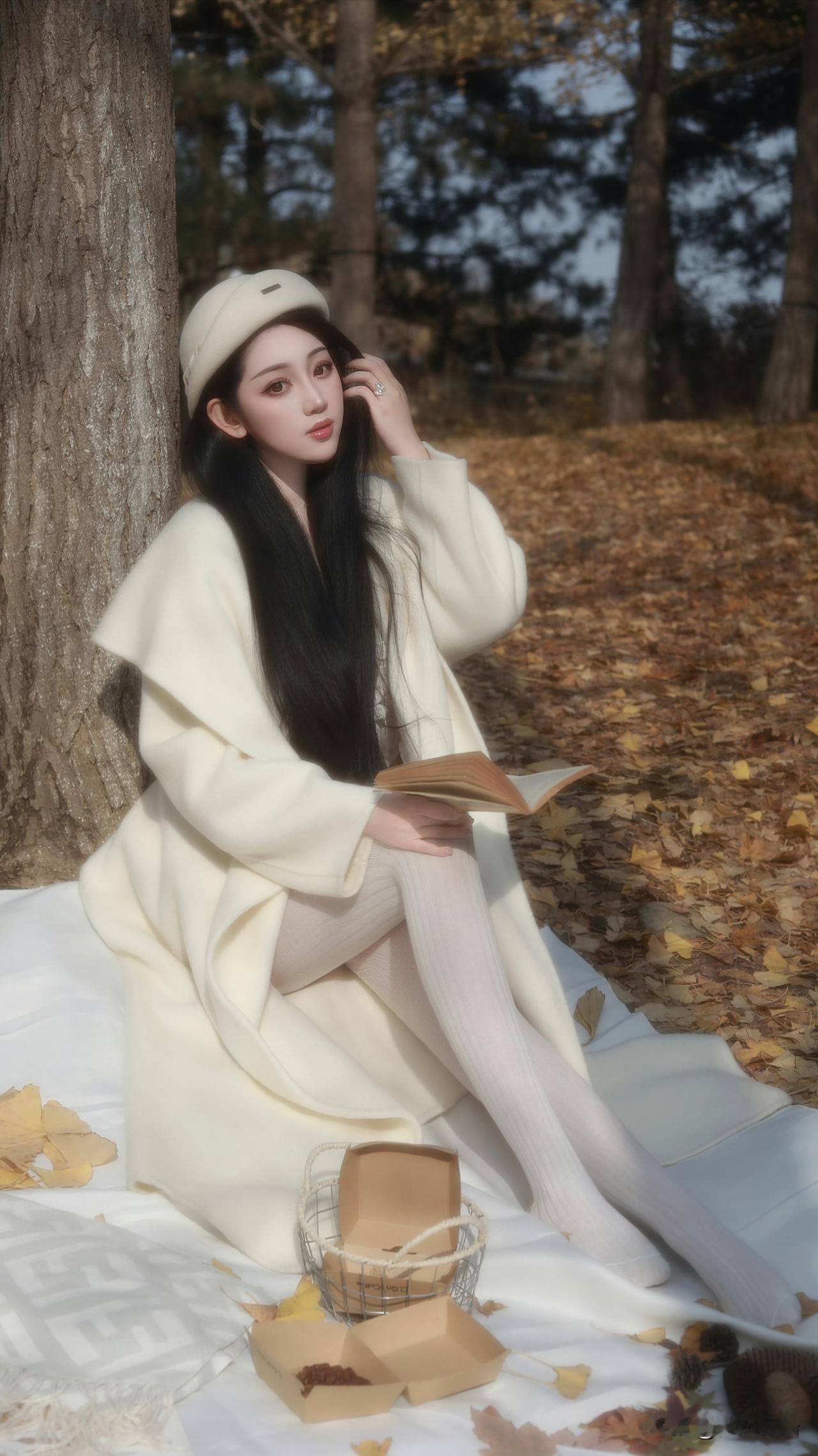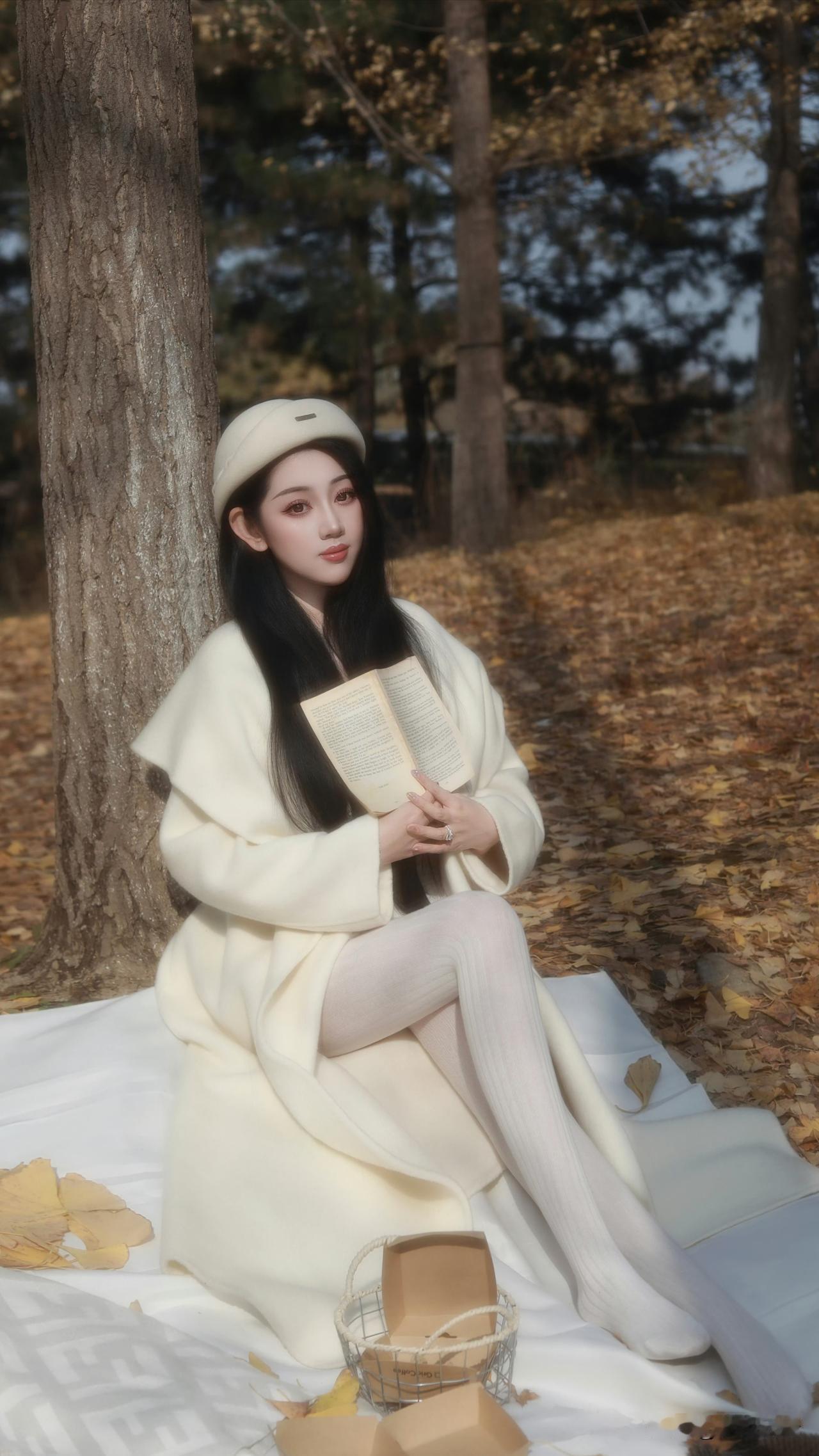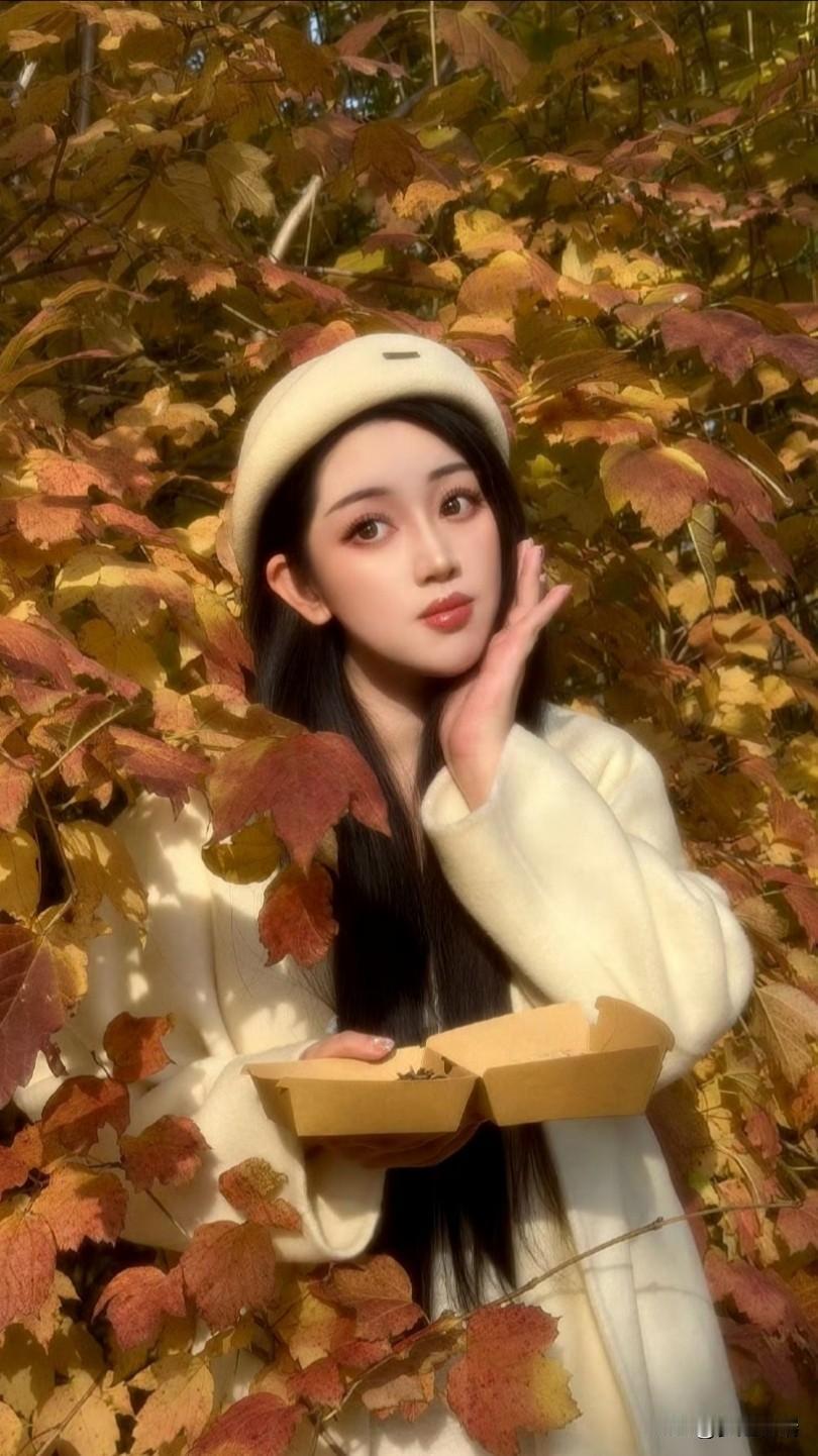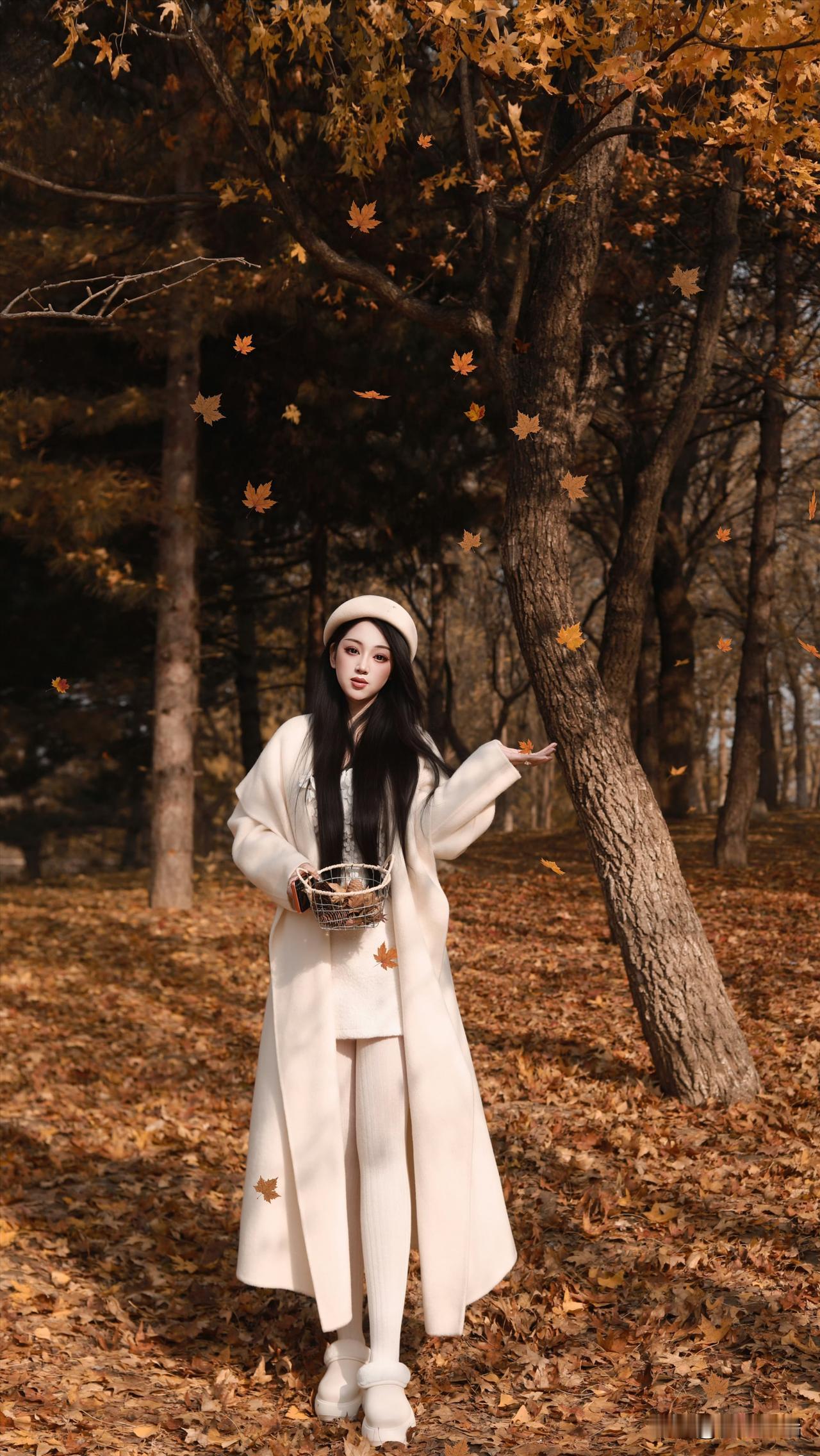 秋日仙子,红叶间轻舞,白衣飘飘,花枝相伴。