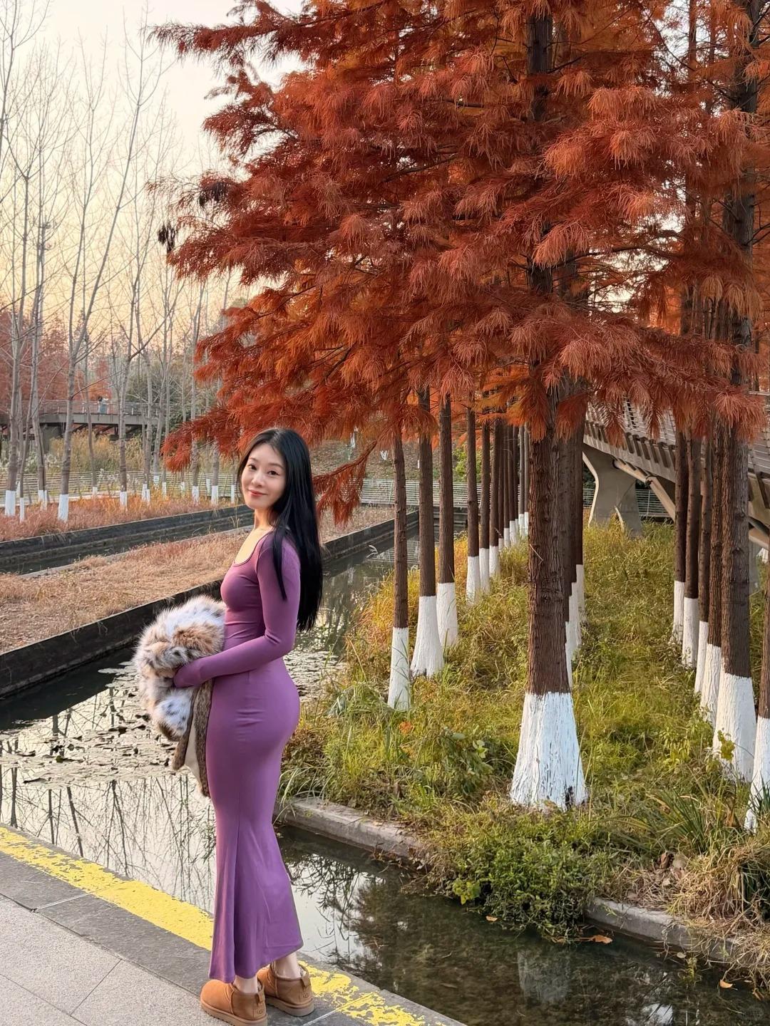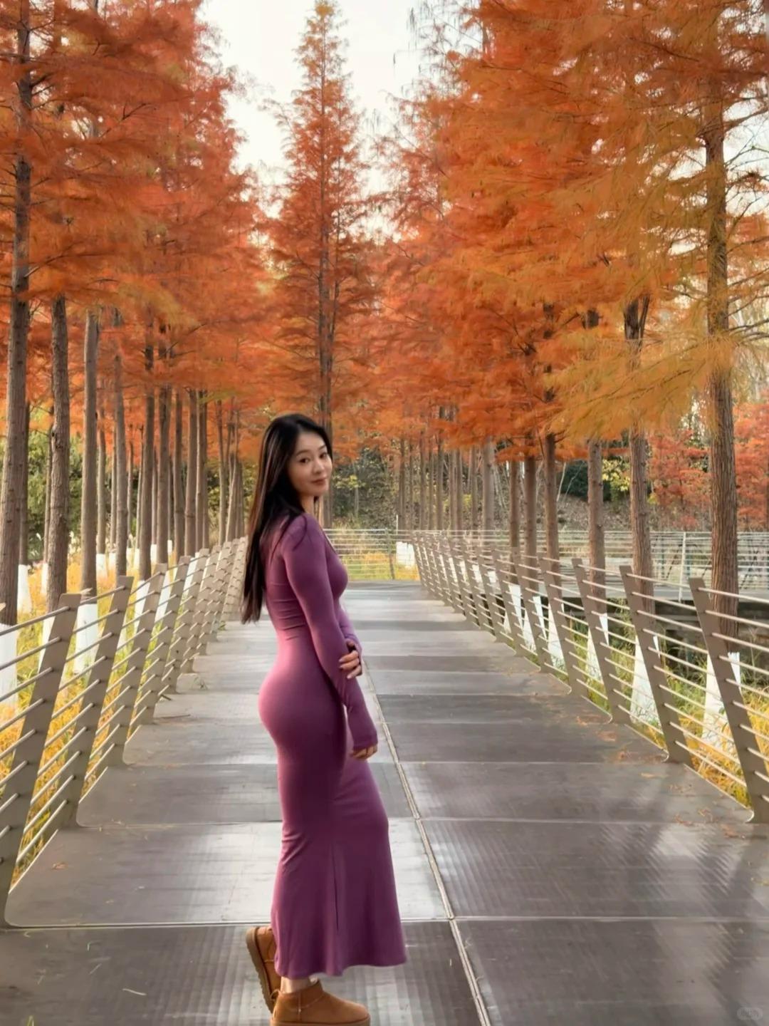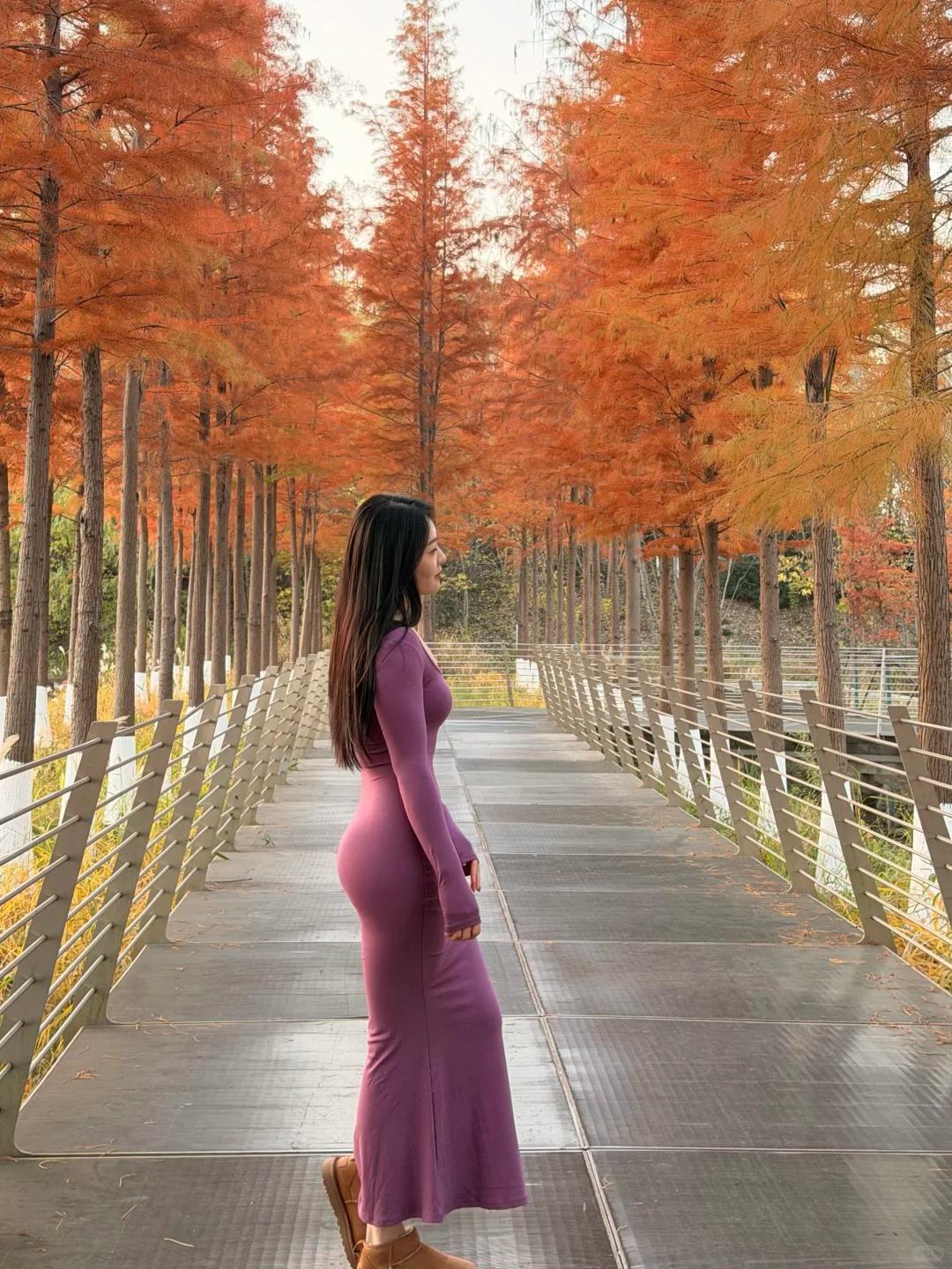 今日份小欢喜是建邺区这片水杉林给的~藏在闹市区的静谧太治愈了!还没进园就被门口的景致勾得雀跃不已,红棕相间的水杉笔直矗立,光影透过枝叶洒下斑驳纹路。穿了件紫色连衣裙,漫步其间才懂这颜色多有韵味,温柔地融进杉林景致里。隔绝了街头的喧嚣,只剩风拂枝叶的轻响,随手拍都是氛围感大片。原来在城市中心,也能寻得这样一方安放情绪的小天地呀~