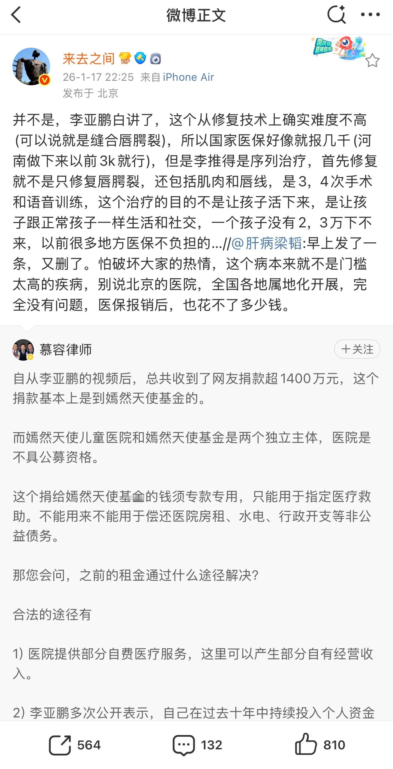 嫣然医院 唇腭裂治疗唇腭裂治疗有两种方法,传统方法更便宜,但是效果不好,李亚鹏推的序列治疗效果更好,但是成本更高。李亚鹏当时在北京建立这个医院有其当时的合理性,也确实做了不小贡献。但是个人觉得不应该是指责房东的理由,你李亚鹏做慈善,但是房东是在做生意,不能拿现在的房租来看2019年,那时候的房地产市场和现在完全是天差地别。有人说像医院这种租约都是很久的,但之前他们签的租约10年也不短了。李亚鹏人可能不错,但是他做生意是真不行。老张杂谈
