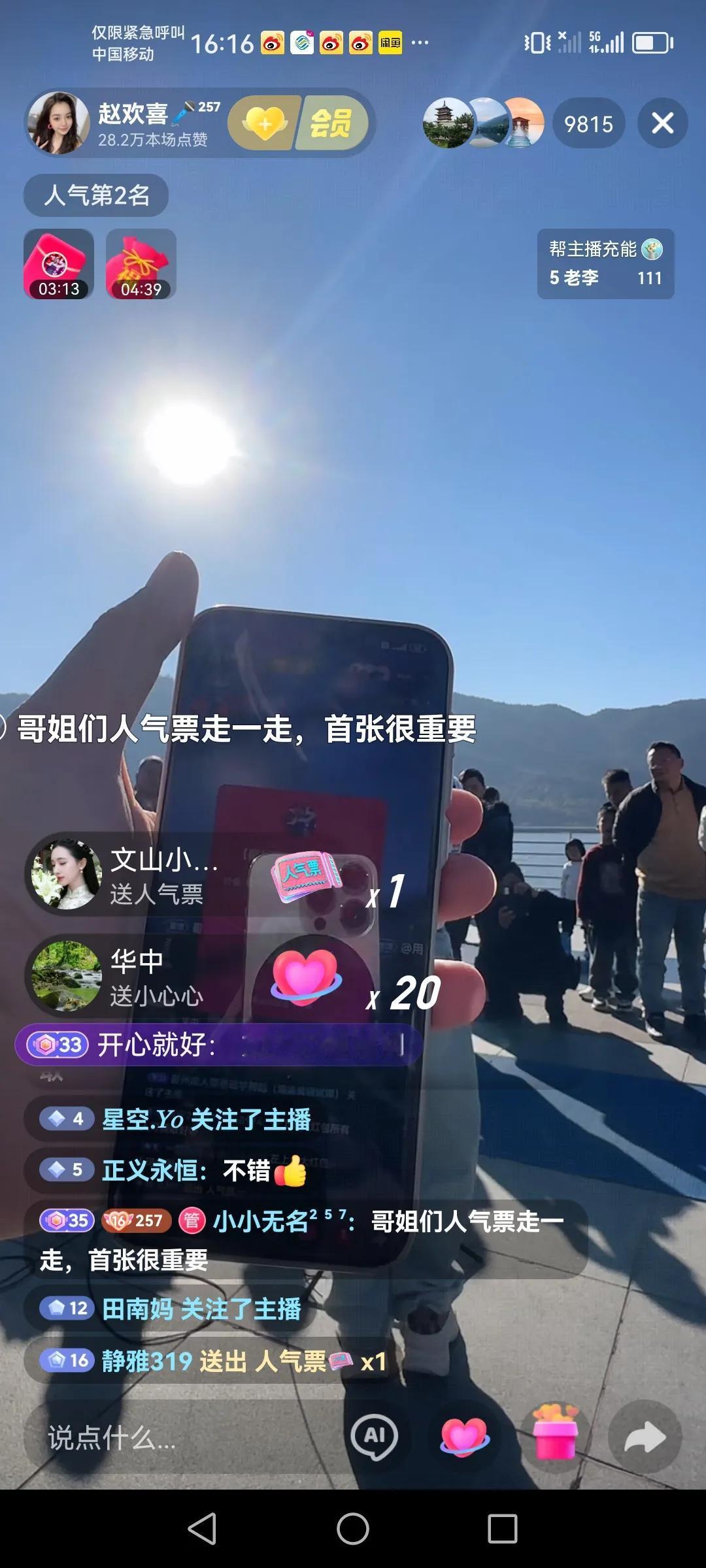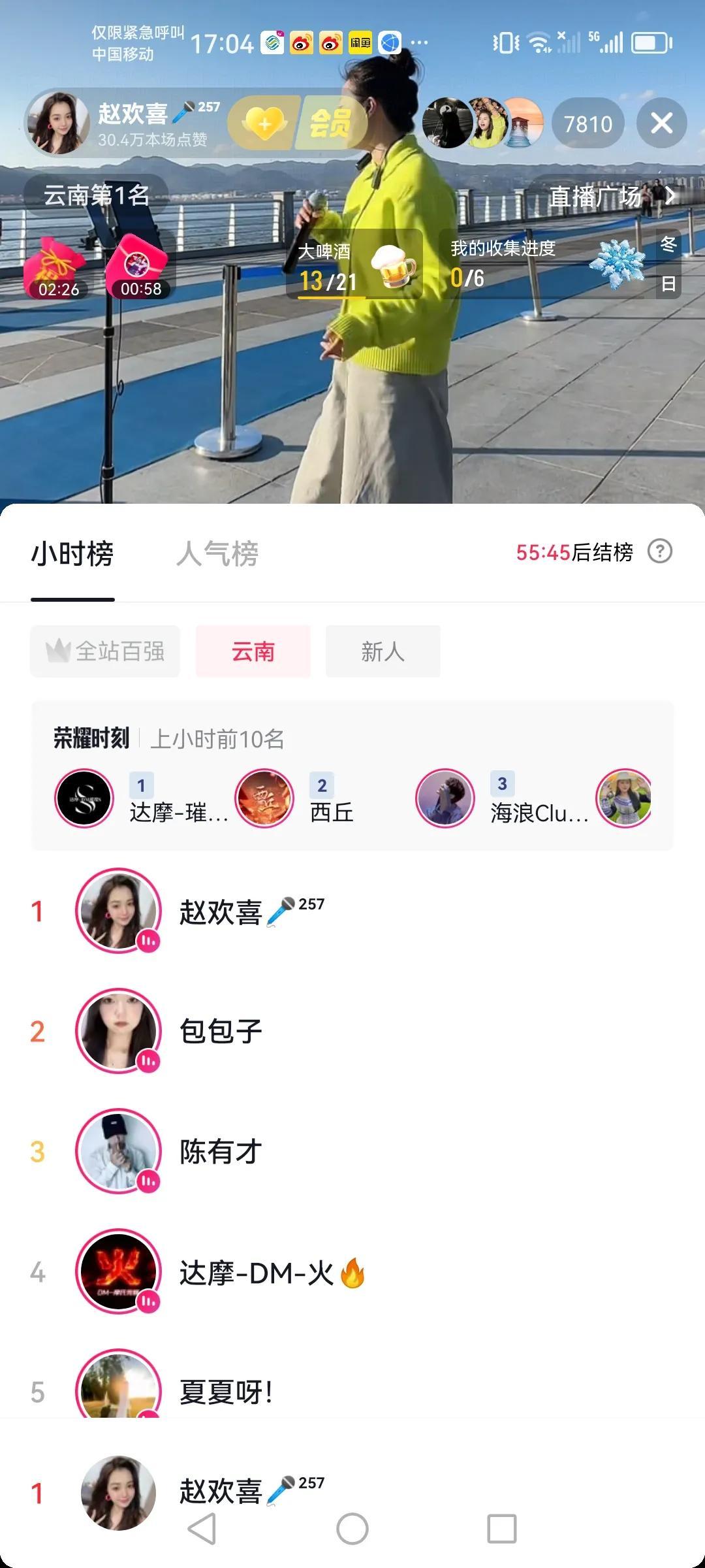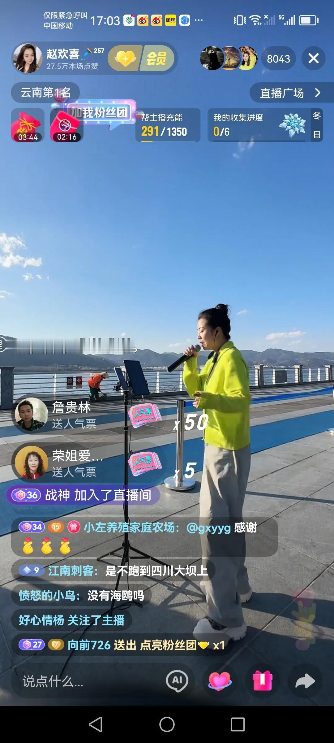 这几天都在昆明的海埂大坝路演 很喜欢正能量的一个业余歌手,赵欢喜,跟随山歌响起的地方,四川德阳女孩赵欢喜这几天都在海埂大坝路演直播,每天播一个多小时,看来喜欢听她唱歌的还是挺多的,高峰时云南第一名,今天是云南第二名,人气榜也是云南第二名,还是不错的,现在的社会已经这样了,咱们还是要接受现实,希望赵欢喜川妹子网络道路上一路长虹。 以上仅供参考,属个人意见!