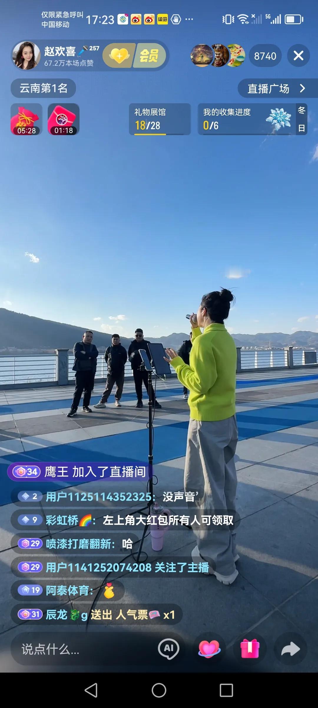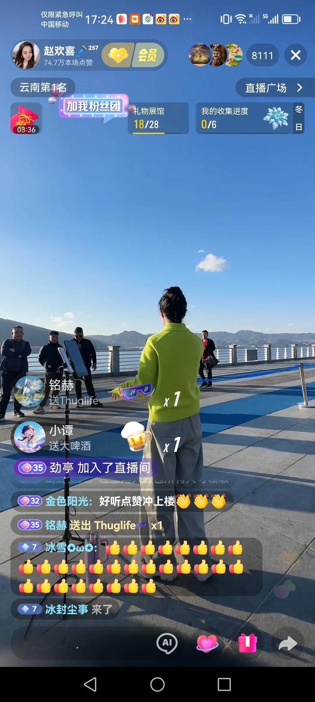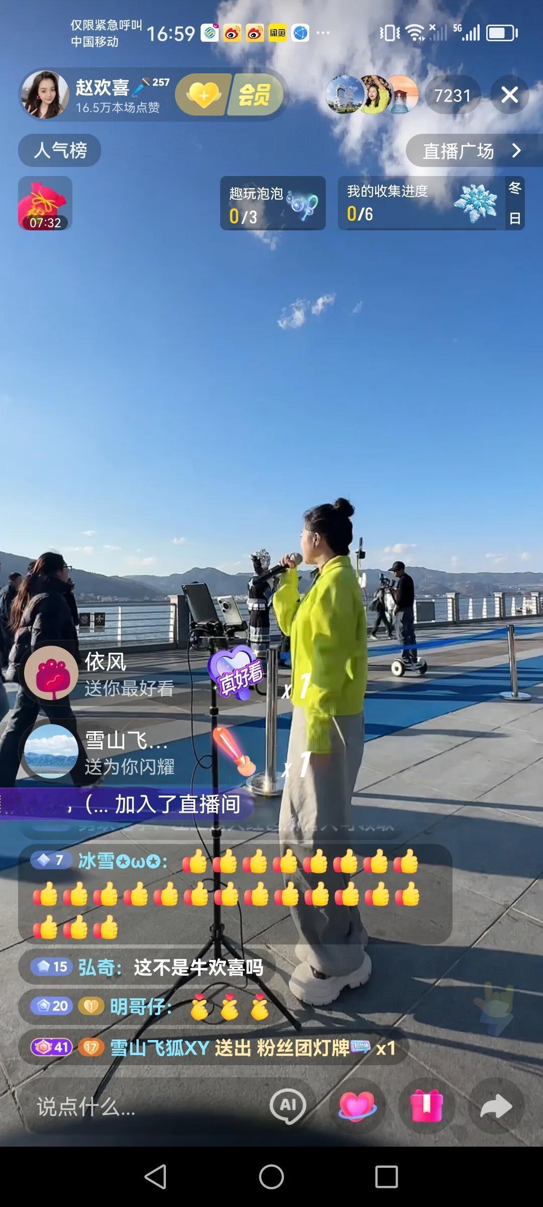 这几天都在昆明的海埂大坝路演 很喜欢正能量的一个业余歌手,赵欢喜,跟随山歌响起的地方,四川德阳女孩赵欢喜这几天都在海埂大坝路演直播,每天播一个多小时,看来喜欢听她唱歌的还是挺多的,高峰时云南第一名,今天是云南第二名,人气榜也是云南第二名,还是不错的,现在的社会已经这样了,咱们还是要接受现实,希望赵欢喜川妹子网络道路上一路长虹。 以上仅供参考,属个人意见!