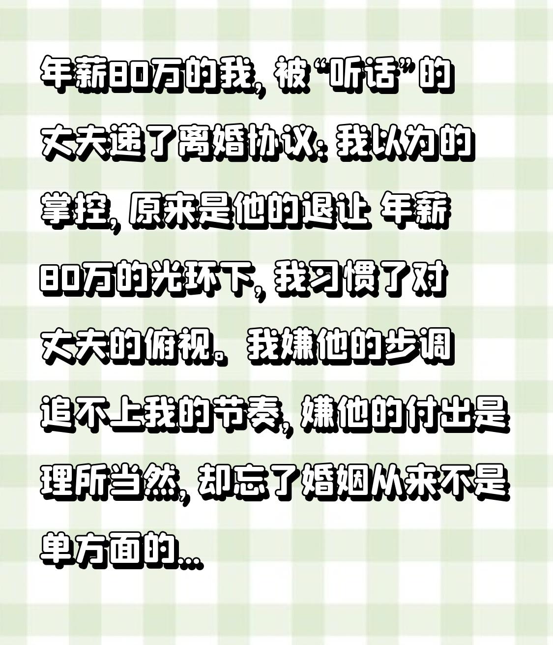 年薪80万的我,被“听话”的丈夫递了离婚协议:我以为的掌控,原来是他的退让 年薪80万的光环下,我习惯了对丈夫的俯视。我嫌他的步调追不上我的节奏,嫌他的付出是理所当然,却忘了婚姻从来不是单方面的迁就,而是两个人的双向奔赴。 上周六的拒绝,不过是压垮骆驼的最后一根稻草。我以为他会像从前一样,默默收起失落,第二天依旧早起为我做便当;以为他日复一日的留灯、毫无怨言的照料生病的母亲,都是“听话”的证明。直到那份离婚协议书摆在眼前,他平静的眼神里没有波澜,我才后知后觉地惊醒——那些年的包容与退让,从来不是卑微,而是他在婚姻里,耗尽了最后一丝期待。 他说签完字,房子归我。可这冷冰冰的房产,哪里抵得过无数个被我忽略的、满是烟火气的清晨与黄昏?我总觉得自己站在高处,却忘了婚姻的天平,早已在我的轻视里,悄悄失衡。原来,一个人的懂事,攒够了失望,就会转身;而我仗着他的爱肆丈夫执意离婚 丈夫如此要离婚 丈夫辞职 意挥霍的日子,终究走到了尽头。