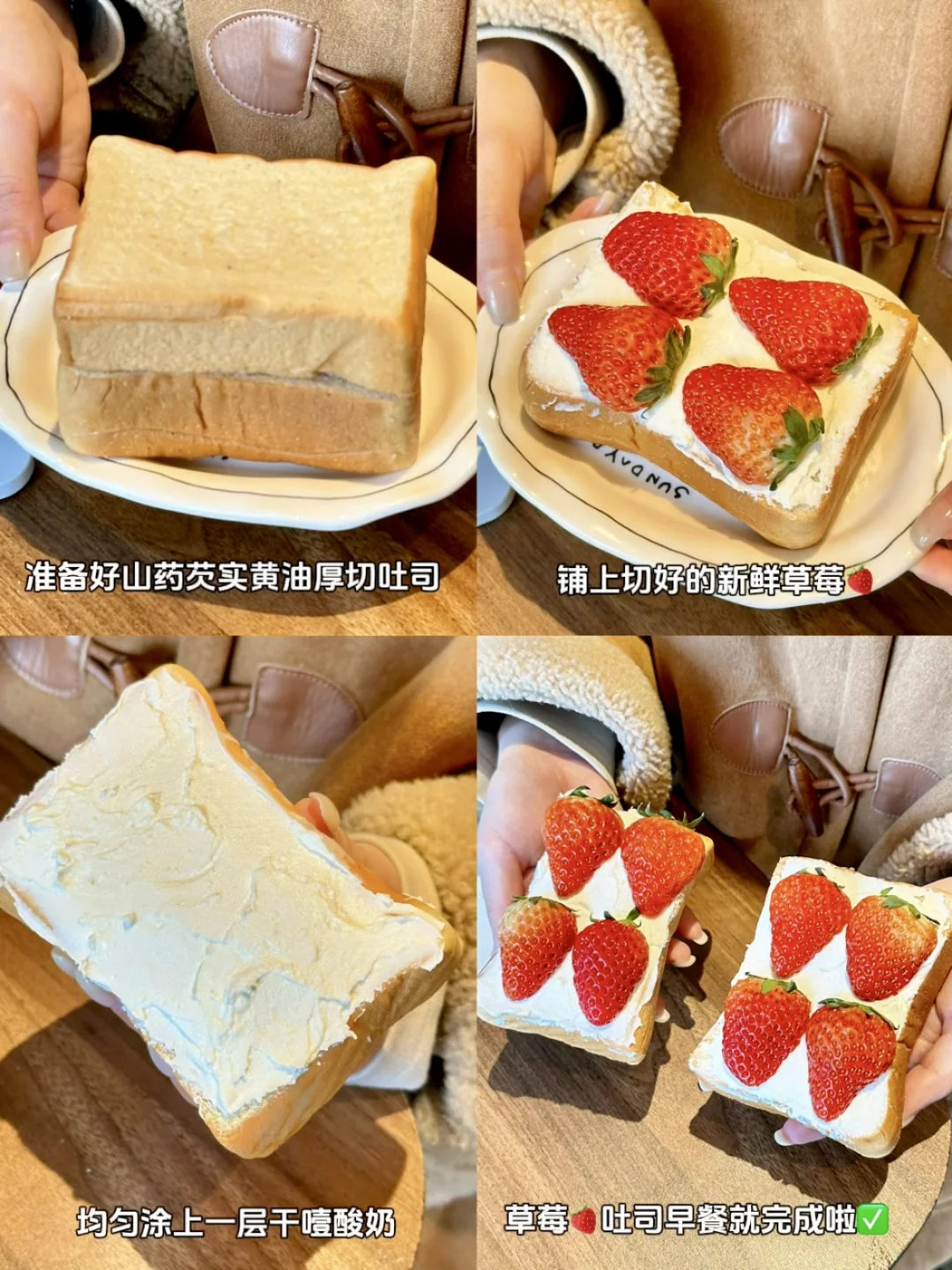 把干噎酸奶均匀抹在吐司上,再铺上新鲜草莓切片,吐司的奶香混着草莓的清甜,酸甜不腻,
