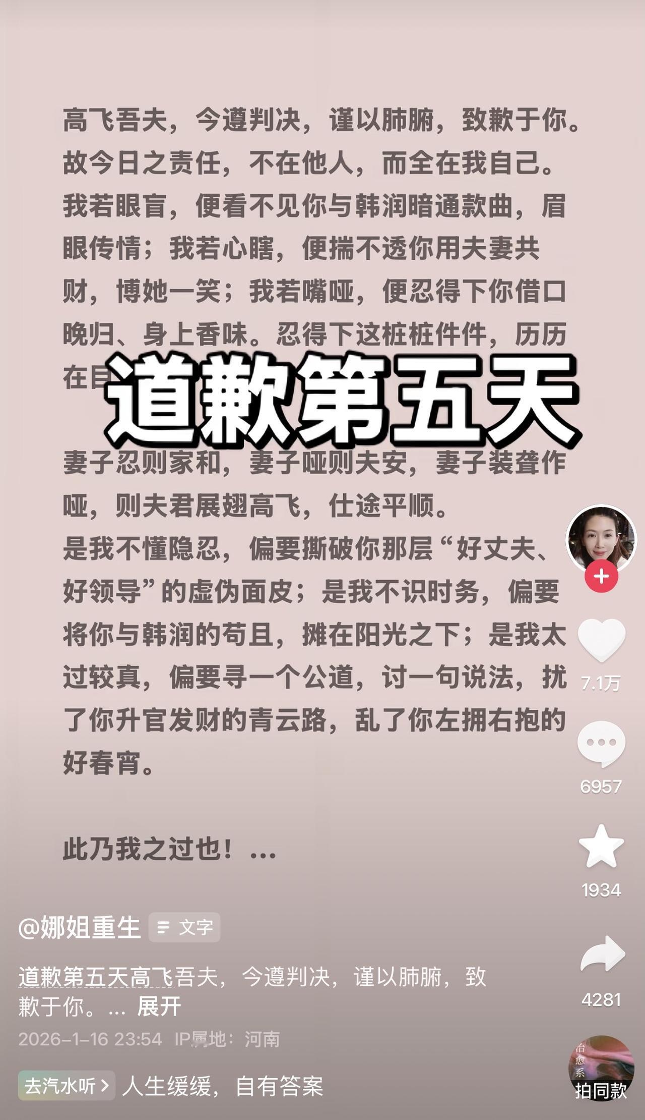 这两天抖音有个娜姐的博主,因为向老公和小三道歉火出圈了,粉丝快涨到一百万了! 老公出轨同事五年,被这个娜姐知道了,那肯定得闹,得骂啊!于是让她老公和小三找到把柄了,把她告上法庭! 于是法官判了让她在互联网道歉15天,这法官高啊,即没徇私枉法,还伸张了正义! 这哪是道歉啊,分明是公开处刑!把他们的那点事闹的全世界都知道了! 于是这位娜姐就撒欢了,今天第七天了,从第五天开始就玩上文言文了! 现在这老公和小三互联网社死!据说老公也被单位开除了! 本来是伦理普法剧,现在变成爽剧了!看着太招笑了! 同时也感慨,婚姻到底是什么?盛装出席奔向人间疾苦吗?好在这个娜姐心态挺好的,也算因祸得福,成网红了![捂脸][捂脸][捂脸][捂脸]