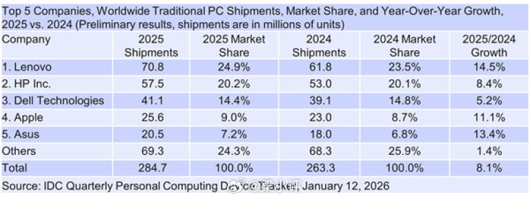 2025年全球PC市场出货量排行榜TOP51、联想,7080万台,+14.5%2、惠普,5750万台,+8.4%3、戴尔,4110万台,+5.2%4、苹果,2560万台,+11.1%5、华硕,2050万台,+13.4%