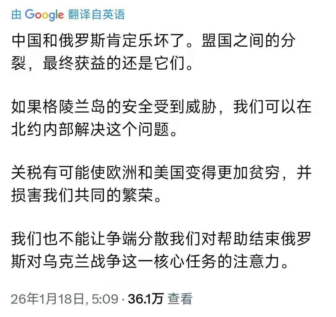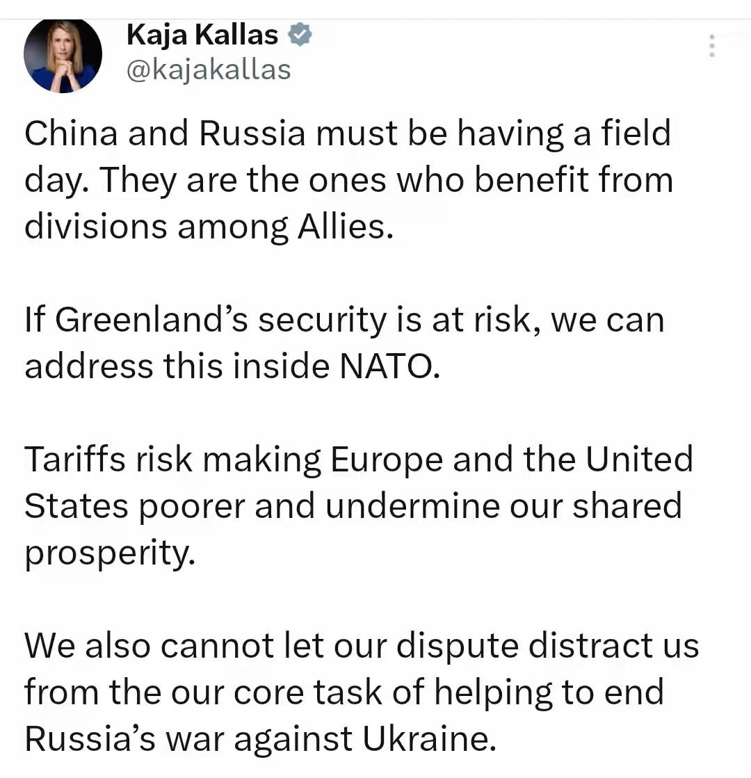 欧盟卡拉斯再发谬论:美欧分裂让中俄很高兴! 北京时间1月18日,欧盟外交与安全政策高级代表卡拉斯发文表示,盟国之间出现分裂,最终得利的是它们,中国和俄罗斯肯定高兴坏了。格陵兰岛问题我们能在北约内部解决,关税或让欧洲和美国变得更穷困,还会损害我们共同的繁荣。但这不能分散我们帮助结束俄乌战争这一核心任务的关注。 说美欧分裂让中俄高兴,咋就这么爱给人扣帽子呢?她还觉得自己挺有道理,可实际上就是头脑简单、目光短浅。只知道拿意识形态来评判,也不看看美欧自己干的那些见不得人的破事儿。 美欧之间的关系从来都不是铁板一块,利益才是他们之间关系的指挥棒。如今,美欧在贸易、能源、地缘政治等诸多领域存在着巨大的分歧和矛盾。美国为了自身利益,不断对欧洲盟友进行经济制裁、贸易打压和武力威胁,这才是让欧洲国家利益受损害的重要原因。 而且欧洲一边喊着要解决俄乌战争,一边又在那里制造内部矛盾,这不是自相矛盾嘛。说到底,她就是不愿意正视自身问题,就会甩锅给别人,这种酸言酸语实在是让人看笑话。