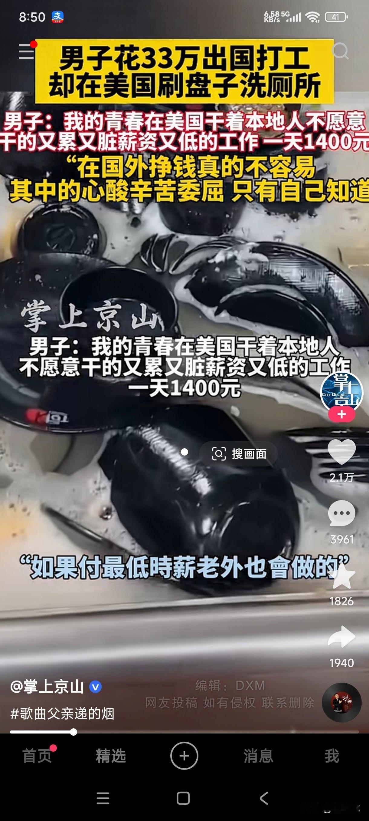 男子花33万出国打工,却在美国刷盘子洗厕所,干着本地人不愿意干的又脏又累工资又低的活,一天1400元! 用自己的双手劳动挣钱也是凭本事吃饭不是吗?每个人都有自己的特长,这位男子能花33万出国打工,可见他是下定了吃苦耐劳的精神,这种又脏又累的活一般人还真干不了,但一天的薪资居然达到1400元,那就是说一个月可以挣四万多,那一年岂不是挣五十多万了,这样算下来出国所花的33万半年多一点就可以挣回来不是吗? 不知道国外真的是薪资高,还是有人故意吹捧的,能花33万出国打工,为什么不用这33万在国内做个啥小生意呢?花费如此多的钱这样做值的吗?