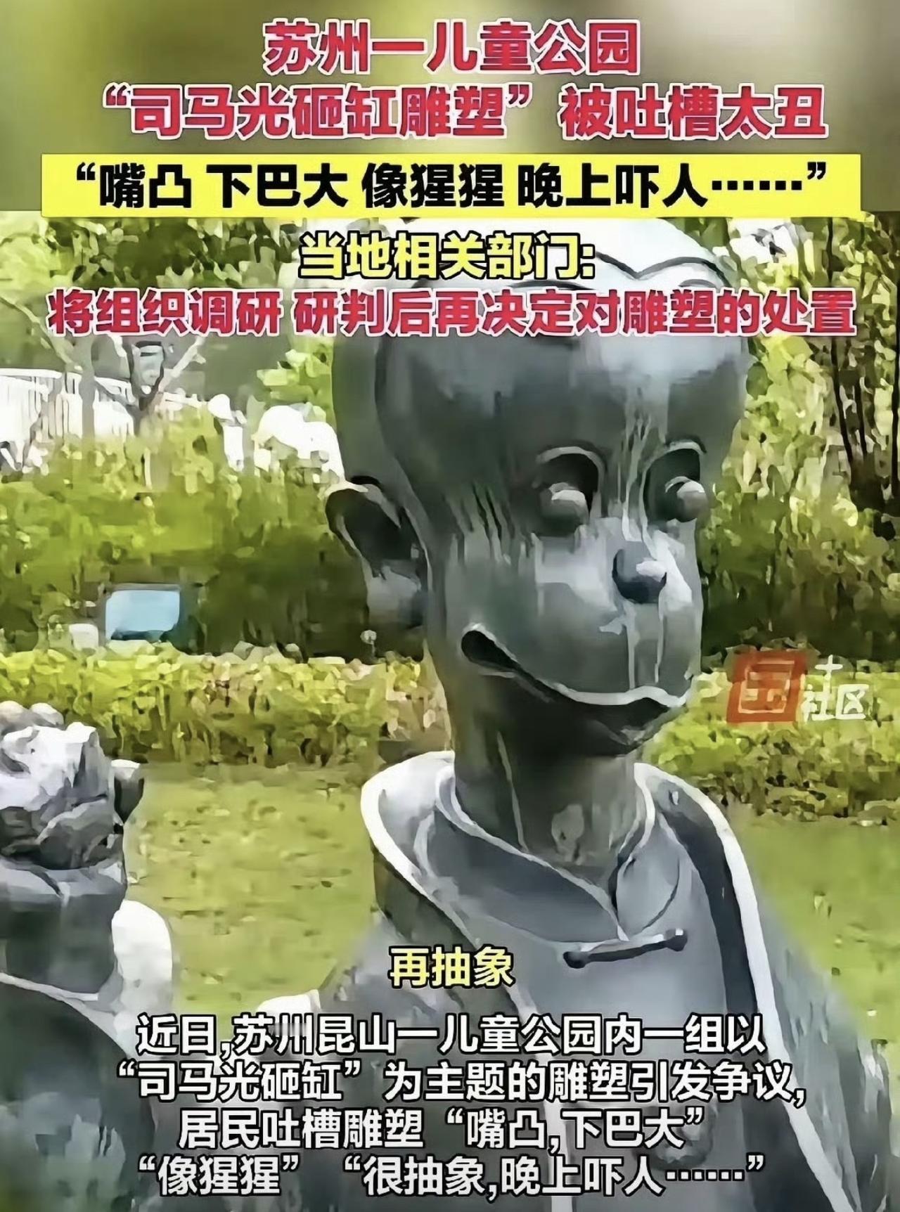 又来了,这是没完了!苏州一儿童公园内:司马光砸缸的雕像! 你跟我说这是司马光?这怕是大马猴吧?太惊悚了!拜托,这是儿童公园,小孩看了会怎么样?我这个成年人看了都不舒服呢! 你这是什么画风,想表达啥,小孩的审美都被你们带跑偏了!什么是好,什么坏,什么美,什么是丑,都分不清了! 看来在艺术界藏了不少鬼啊!那么你就好奇了,为啥都藏在艺术界?!因为艺术界没门槛,高考200分就能进!最关键的是他们丑化什么都可以冠冕堂皇的打着艺术的旗号!