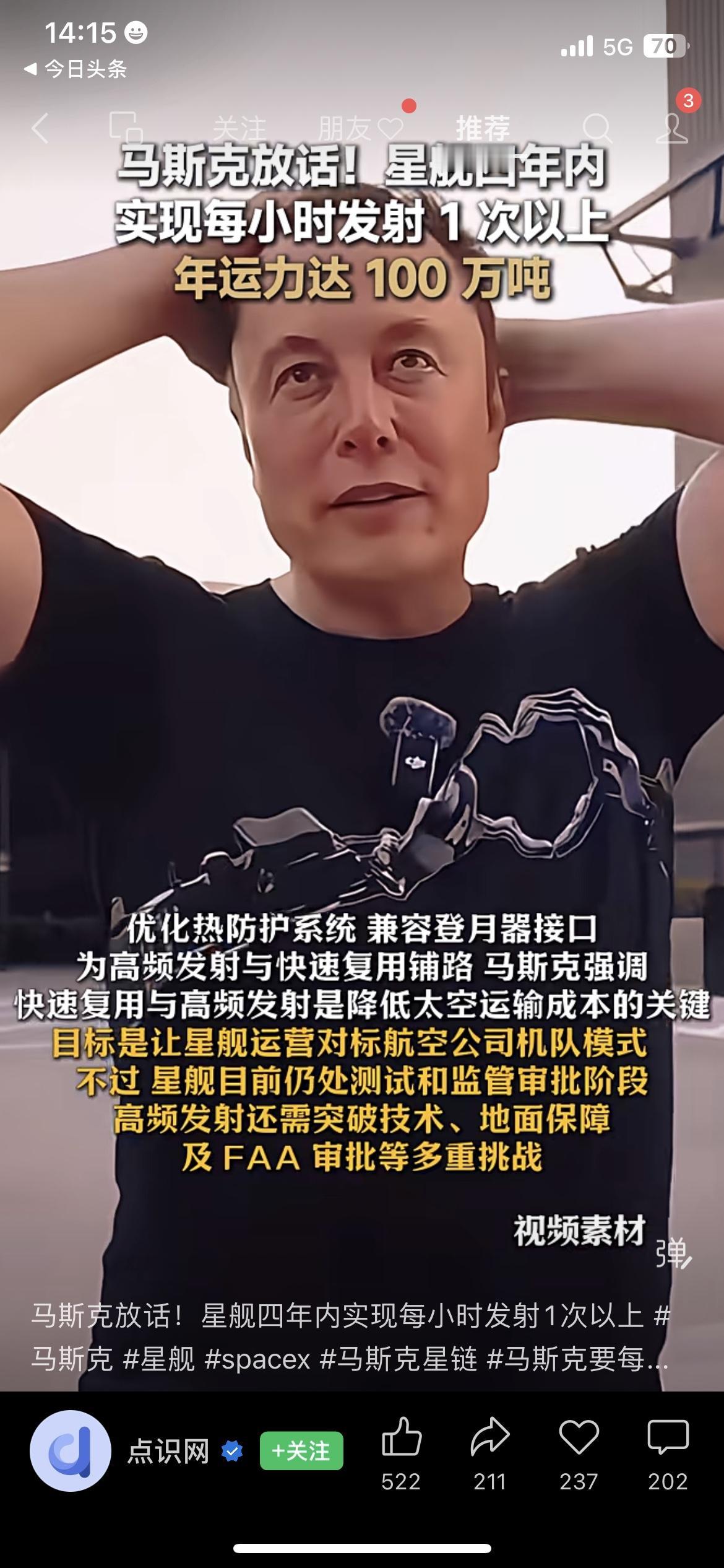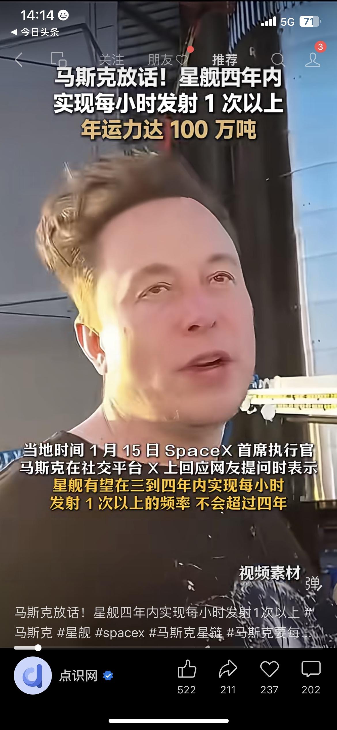 马斯克又放大话!星舰将在4年内实现每小时发射1次,年运力直达100万吨!这意味着太空旅行成本会大降,咱们普通人也能圆太空梦? 马斯克的野心,是普通人触手可及的太空门票。 你觉得4年内,咱们真能坐上白菜价太空船吗? 马斯克星舰 太空探索 科技热点