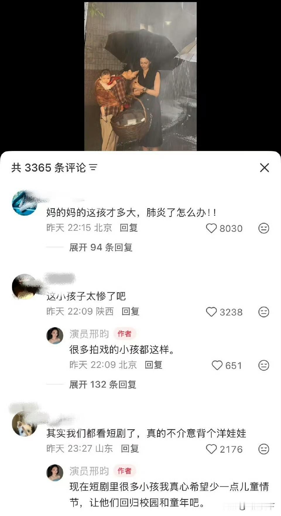 这800块是非挣不可吗,是什么样的家长这么狠心让自己的小孩淋雨,万一生病了咋整,这么小就被父母当成赚钱的工具,太可怜了,没能力养就别生。 短剧演员邢昀吐槽某剧组夜里拍雨戏,一直让孩子淋洒水车制造的瓢泼大雨,光看照片都觉得残忍,大人淋雨还会感冒,何况是小孩,我都怀疑是不是亲生的了,这年头短剧是越来越颠了[捂脸][捂脸] 短剧