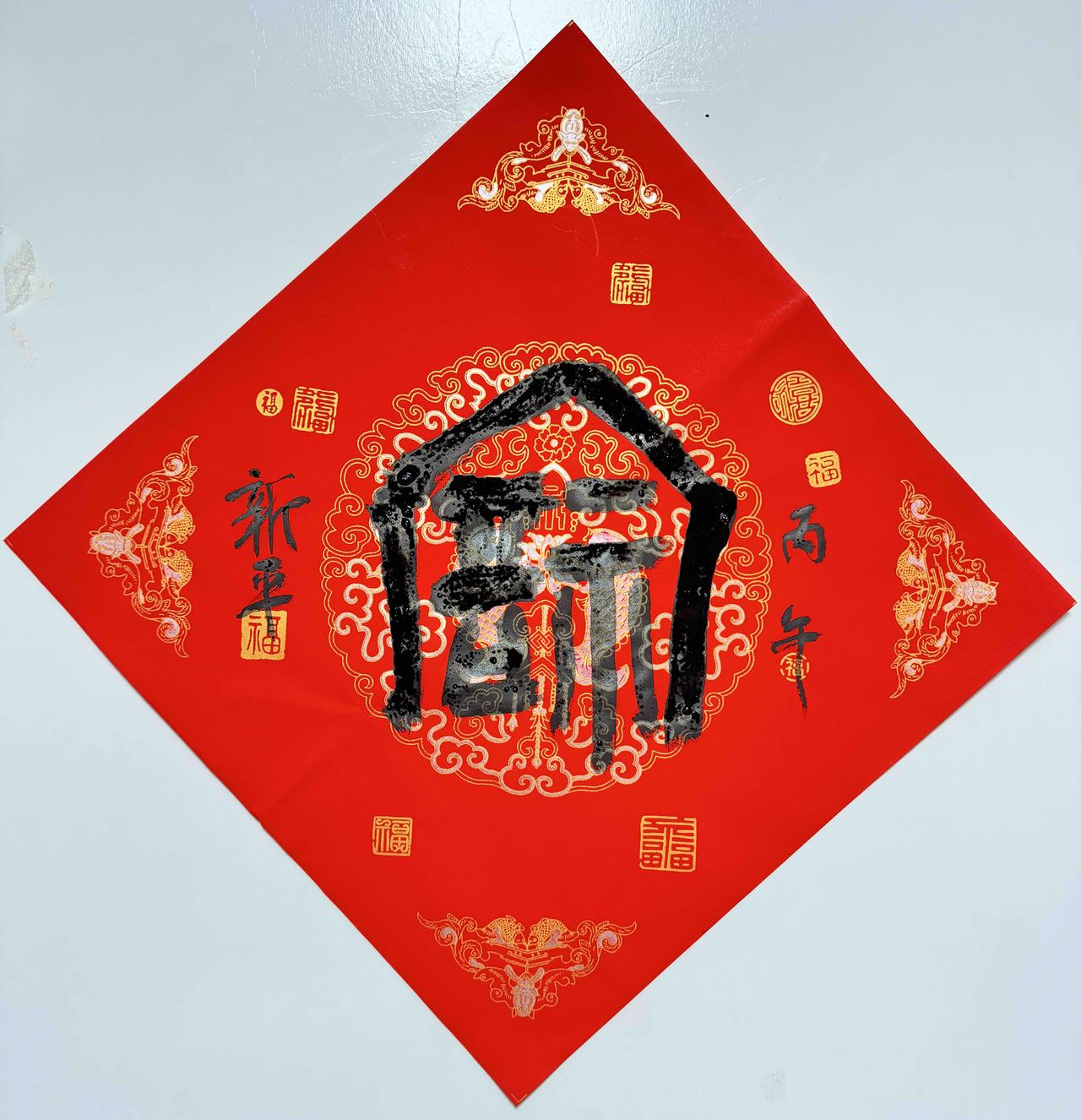 手写春联,湖南省书法家协会会员所写,138cm*46cm,红纸黑字,内容“福照家