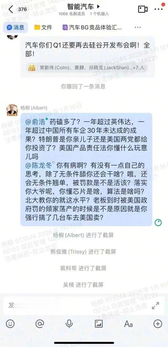 没等大家从震惊中回过神,这位“孤勇员工”的第二条消息已经弹出,这次还顺带@了群里一位陈姓高管,火力丝毫不减:“你懂芯片是啥,算法是啥吗?北大教你的就这水平?”文字里的质问感几乎要冲破屏幕,仿佛能看到发送者敲下这些字时,指尖都带着力度。紧接着,第三条消息更是直指核心风险:“老板到时被美国政府罚得倾家荡产的时候,是不是原因就是你强行搞了几台车去美国卖?”