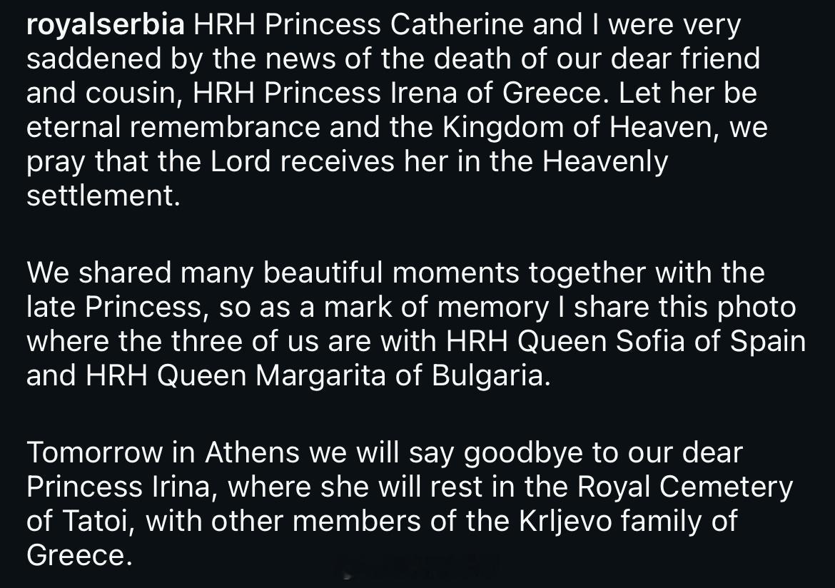 南斯拉夫(今塞尔维亚)王室宣布,南斯拉夫的亚历山大王储和凯瑟琳王储妃将会前往希腊雅典参加艾琳公主的葬礼,并分享与希腊丹麦的艾琳公主、西班牙的索菲亚太上王后和保加利亚沙皇后玛格丽塔(保加利亚沙皇西蒙二世的妻子)的合影🇷🇸