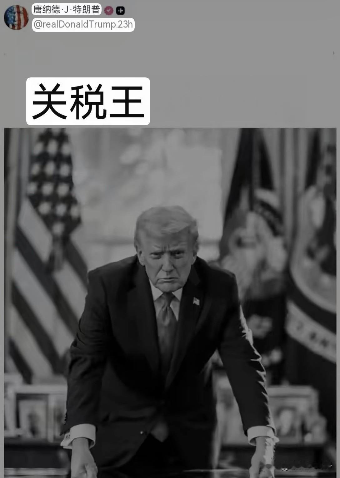 特朗普最近特别喜欢黑白照片,可能他感觉这样的照片更具视觉冲击力,压抑感更强。 昨天特朗普在他的社交媒体上又发了一张黑白照片。 上面简简单单的就写了一句话,关税王。 这是他自己给自己封的头衔。 关税王,未来特朗普的庙号就应该是万税宗! 实至名归啊,真的是实至名归。