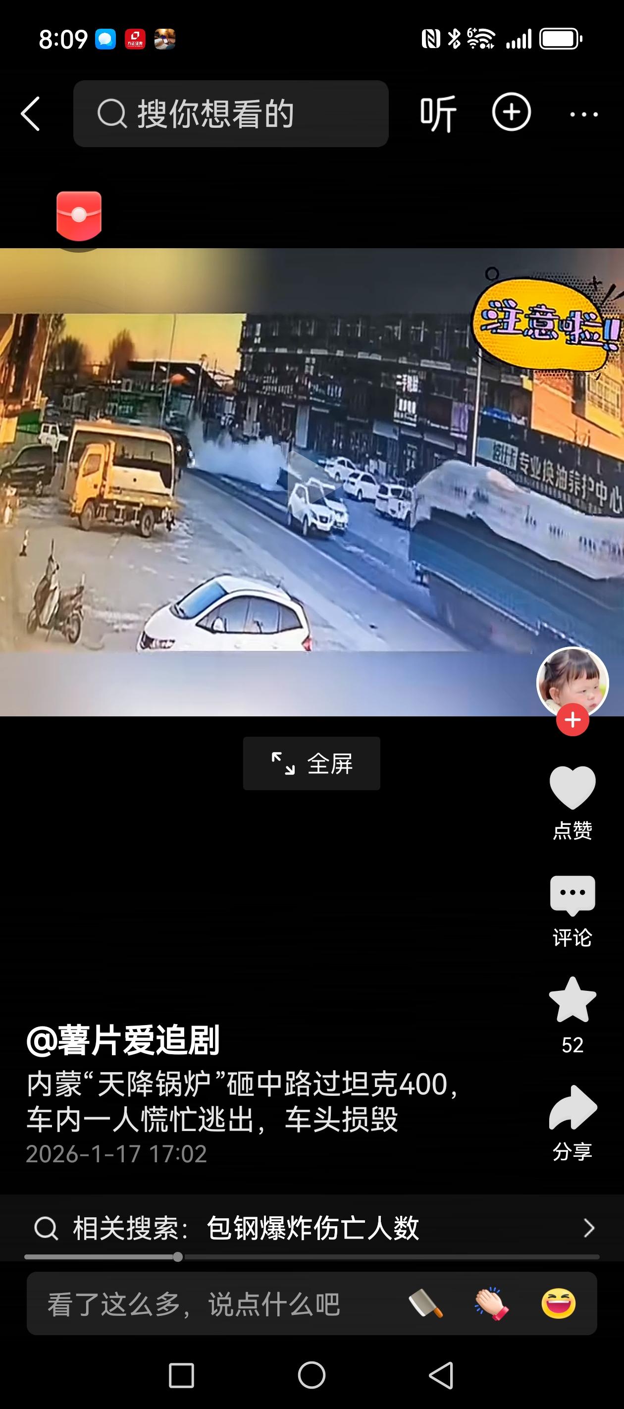 今年最幸运的人出现!咋天内蒙古包头钢厂一板材厂发生爆炸,一个近500斤锅炉体被冲向空中后落下砸在一辆坦克400车引擎盖上,随后车中跑出一人,这人是不是新年第一幸运人!安全生产很重要,祸从天降不应当!