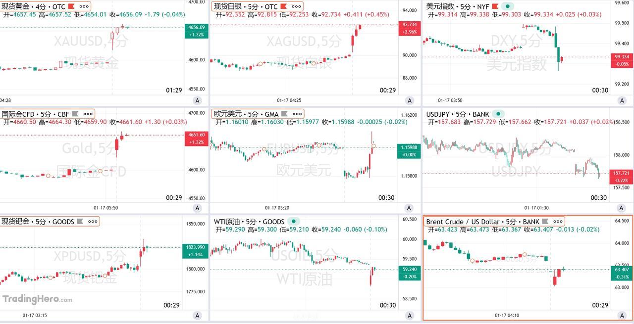 欧美关税威胁重现 金银大幅上扬、股指期货跌1% 周一开盘,现货金银跳空高开。现货黄金盘初突破4660美元/盎司,再度刷新历史新高,日内涨幅达1.4%;现货白银最高涨至92.81美元/盎司,涨幅为2.8%;WTI原油低开0.8%后迅速反弹,基本收复跌幅。纳指期货下跌1%。 周末,特朗普就丹麦自治领地格陵兰岛问题发出关税威胁。有消息称,欧盟多国正考虑对价值930亿欧元的输欧美国商品加征关税。[星星眼][爱慕]吃鲍鱼