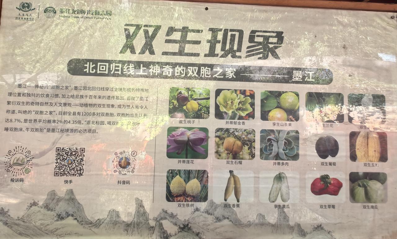 墨江北回归线标志园,神奇的“双生现象” 我们今天离开元江营地,前往普洱。顺道在墨江服务区休息,步行出服务区,去墨江北回归线标志园转了转。 标志园离服务区并不远。服务区后面有一个门是开着的,顺着石梯而上,出门右转沿街步行几百米,再右转过桥即到。 标志园在山上,需要步行石梯或坐飞天魔毯而上。由于爱人爬山不行,我们选择坐飞天魔毯而上,步行而下。两人坐飞天毛魔毯和门票共120元,门票20元/人是半费。 标志园内景点还是很多的。除了明显的北回归线标志线外,有双子星、主标塔、超越塔、石环、日月交辉、哈尼取火塔,以及墨江天文馆等。我们在天文馆内,还通过天文望远镜观赏了太阳。 有一点地理知识的人都应该知道,北回归线是怎么回事。也就是太阳直射地球最北的地方,常说的北纬23.5度。在这个纬度上,有很多神奇的地方,包括世界上最大的撒哈拉沙漠,最深的马里亚纳海沟,最高的珠穆朗玛峰,能量最异常的百慕大三角,最深奥的玛雅文明,最不可思议的金字塔群等,都在这一条纬度上。 作为北回归线上的墨江,还有一个神奇的现象。那就是双生现象,这里的双胞胎特别多,标志园旁边就有一个双胞小镇,很多植物也出现这种情况。 特别是家里面有小孩的,特别适合带出来,到这里打卡。可以在知识与趣味交织中,开启一场浪漫的星际穿越之旅。