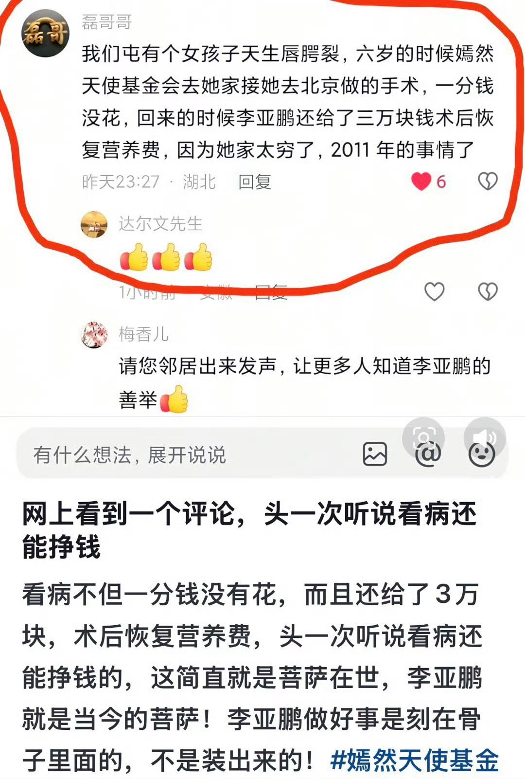 嫣然医院周边居民发声 这么多认可的声音,再看看网络讲的这个案例,真的不评论一下都不行了。突然发现李亚鹏真的有郭靖的感觉,侠者仁心,之前很多人在吐槽他不会做生意,看来只是他心里的侠义还在。给他一个嫣然医院周边居民发声
